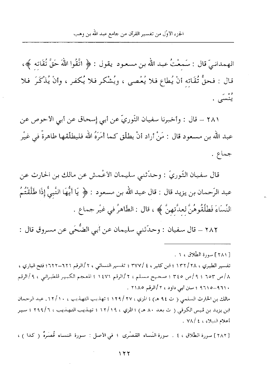281 - قَالَ: وَأَخْبَرَنَا سُفْيَانُ الثَّوْرِيُّ، عَنْ أَبِي إِسْحَاقَ، عَنْ أَبِي الأَحْوَصِ، عَنْ عَبْدِ اللَّهِ بْنِ مَسْعُودٍ قَالَ: مَنْ أَرَادَ أَنْ يُطَلِّقَ كَمَا أَمَرَهُ اللَّهُ فَلْيُطَلِّقْهَا طَاهِرَةً فِي غَيْرِ جِمَاعٍ.