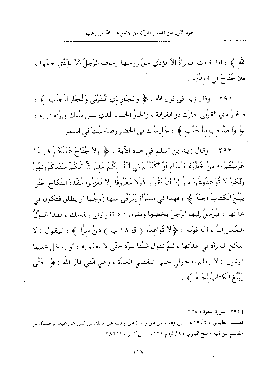 292 - وقال زيد بن أسلم في هذه الآية: {ولا جناح عليكم فيما عرضتم به من خطبة النساء أو أكننتم في أنفسكم علم الله أنكم ستذكرونهن ولكن لا تواعدوهن سرا إلا أن تقولوا قولا معروفا ولا تعزموا عقدة النكاح حتى يبلغ الكتاب أجلة}، فهذا في المرأة يتوفى عنها زوجها أو يطلق فتكون في عدتها، فيرسل إليها الرجل يخطبها ويقول: لا تفوتيني بنفسك، فهذا القول المعروف، أما قوله: {لا تواعدوهن سرا}، فيقول: لا تنكح المرأة في عدتها، ثم تقول شيئا سره حتى لا يعلم به، أو يدخل عليها فيقول: لا يعلم بدخولي حتى تنقضي العدة، وهي التي قال الله: {حتى يبلغ الكتاب أجله}.