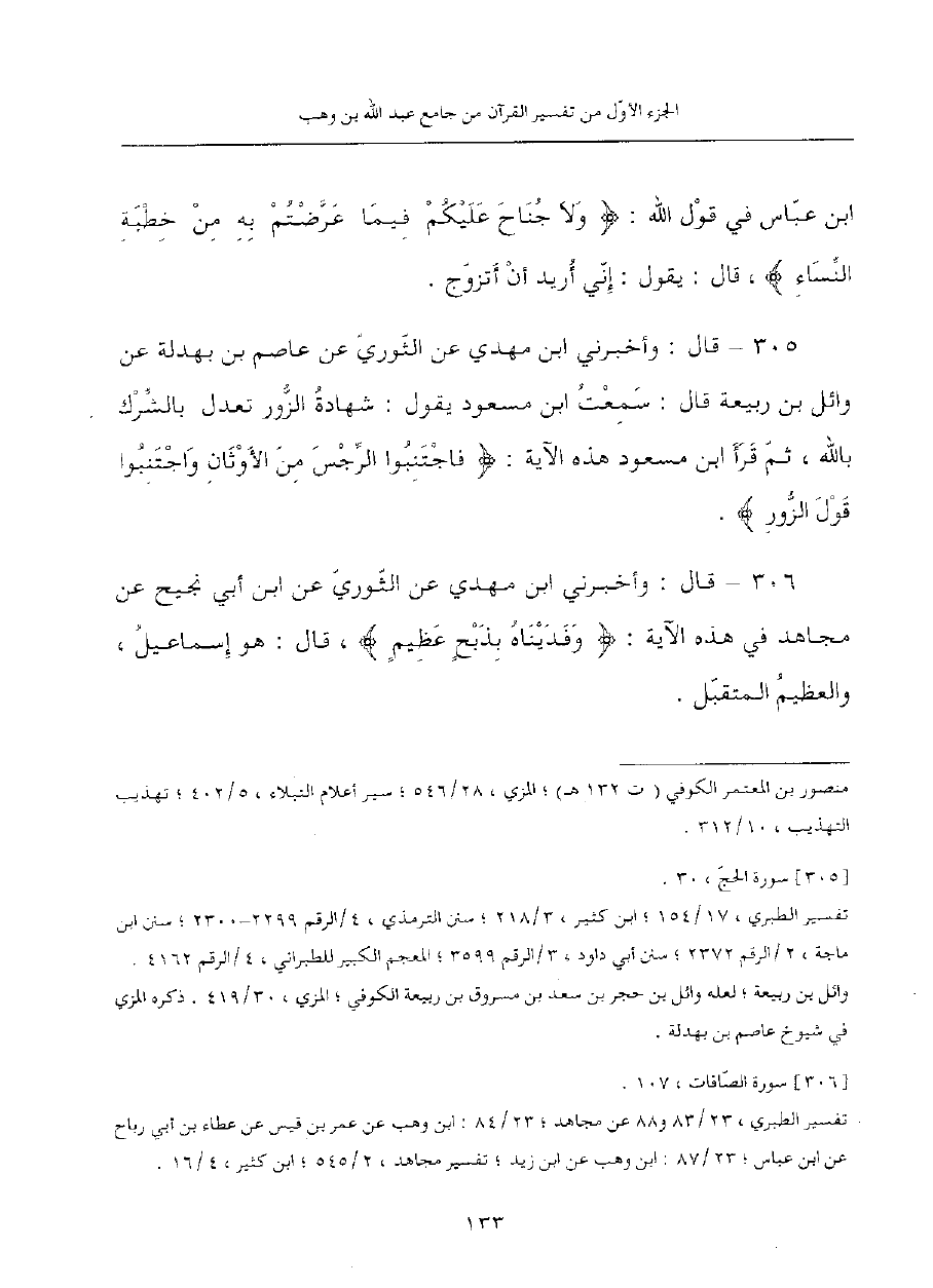 305 - قال: وأخبرني ابن مهدي، عن الثوري، عن عَاصِمِ بْنِ بَهْدَلَةَ، عَنْ وَائِلِ بْنِ رَبِيعَةَ قَالَ: سَمِعْتُ ابْنَ مَسْعُودٍ يَقُولُ: شَهَادَةُ الزُّورِ تُعْدَلُ بِالشِّرْكِ بِاللَّهِ، ثُمَّ قَرَأَ ابْنُ مَسْعُودٍ هَذِهِ الآيَةَ: {فَاجْتَنِبُوا الرِّجْسَ مِنَ الأَوْثَانِ وَاجْتَنِبُوا قول الزور}.