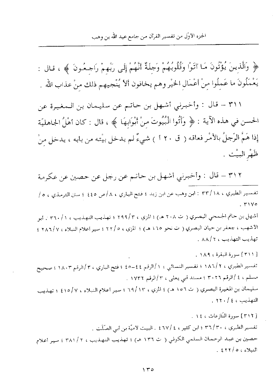 311 - قال: وأخبرني أشهل بن حاتم، عن سليمان بن المغيرة، عن الحسن في هذه الآية: {وأتوا البيوت من أبوابها}، قال: كان أهل الجاهلية إذا هم الرجل بالأمر فعاقه شيءٌ لم يدخل بيته من بابه، يدخل من ظهر البيت.