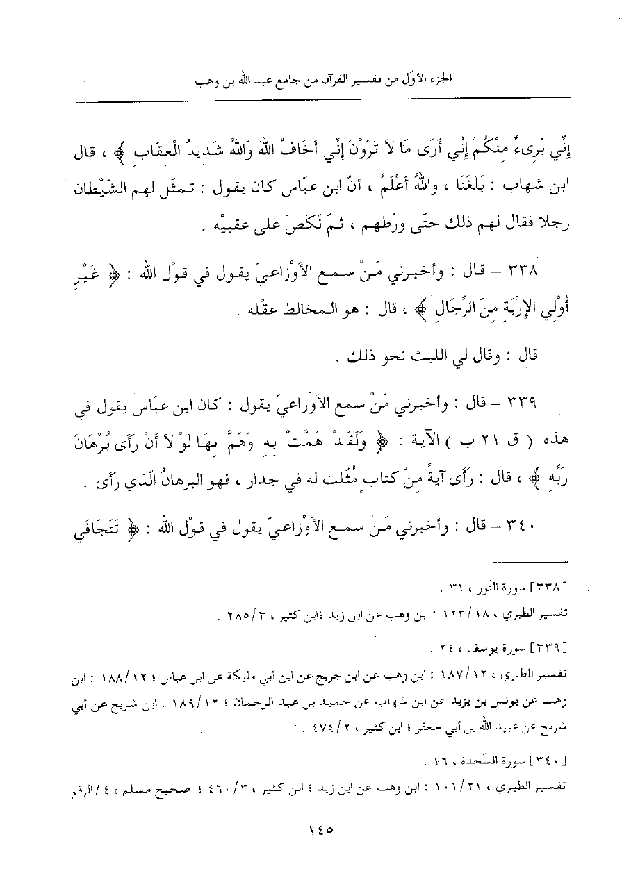 339 - قال: وأخبرني من سمع الأوزاعي يقول: كان ابن عباس يقول في هذه الآية: {ولقد همت به وهم بها لولا أن رأى برهان ربه}، قال: رأى آيةً من كتابٍ مثلت له في جدار، فهو البرهان الذي رأى.