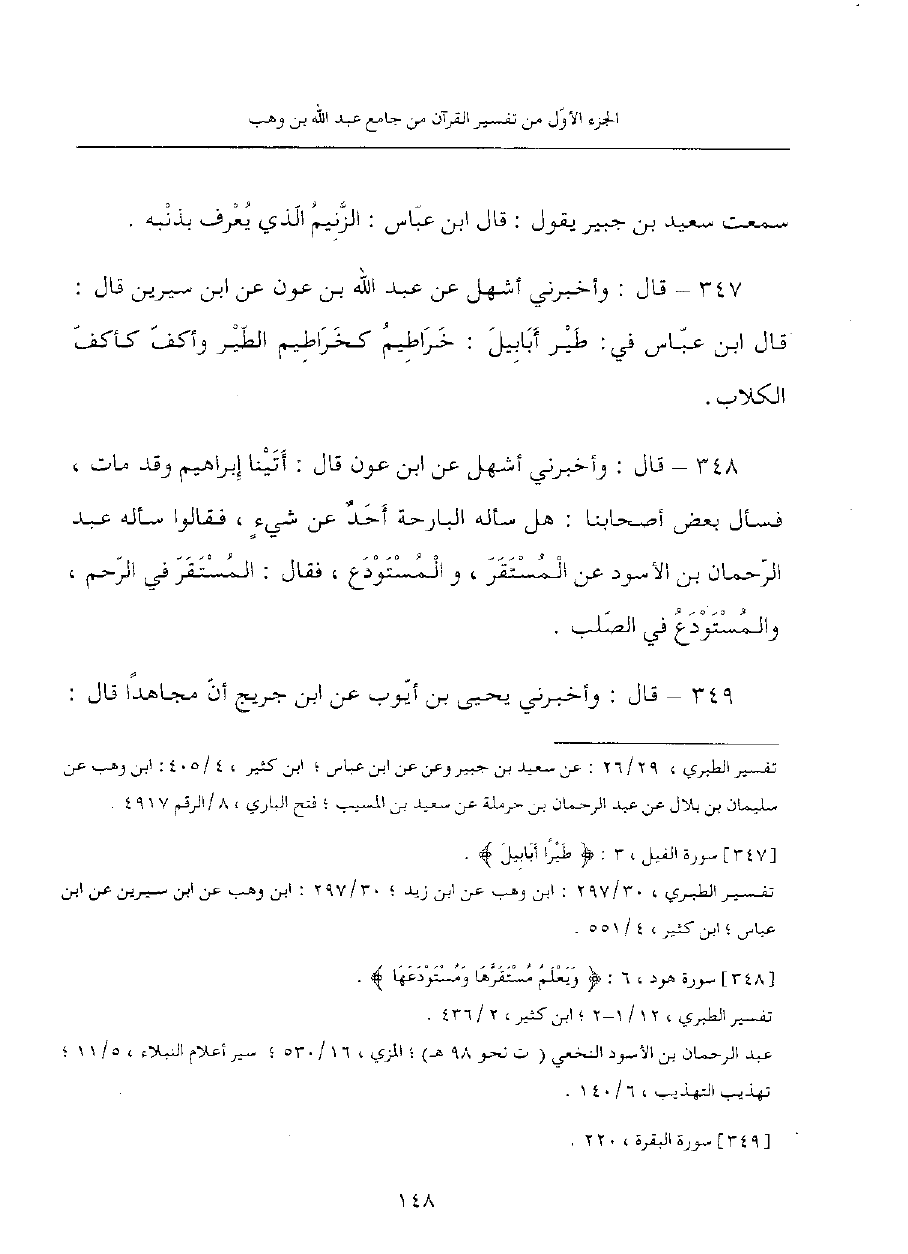 348 - قال: وأخبرني أشهل، عن ابن عون قال: أتينا إبراهيم وقد مات، فسأل بعض أصحابنا: هل سأله البارحة أحدٌ عن شيءٍ، فقالوا سأله عبد الرحمن بن الأسود عن المستقر، والمستودع، فقال: المستقر في الرحم، والمستودع في الصلب.
