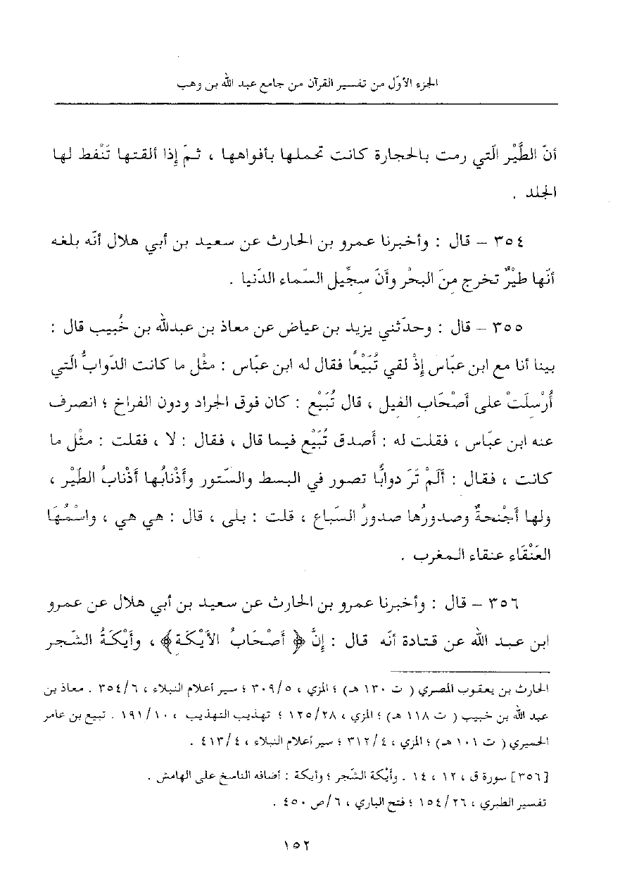 354 - قال: وأخبرنا عمرو بن الحارث، عن سعيد بن أبي هلال أنه بلغه أنها طيرٌ تخرج من البحر وأن سجيل السماء الدنيا.