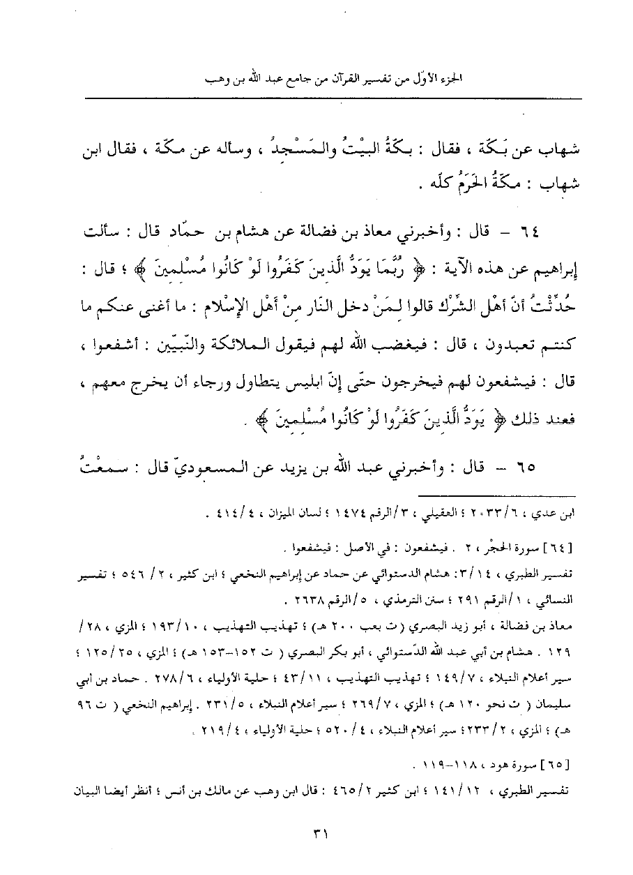 64 - قال: وأخبرني معاذ بن فضالة عن هشام بن حماد قال: سألت إبراهيم عن هذه الآية: {ربما يود الذين كفروا لو كانوا مسلمين}؛ قال: حدثت أن أهل الشرك قالوا لمن دخل النار من أهل الإسلام: ما أغنى عنكم ما كنتم تعبدون، قال: فيغضب الله لهم فيقول الملائكة والنبيين: أشفعوا، قال: فيشفعون لهم فيخرجون حتى إن إبليس يتطاول ورجاء أن يخرج معهم، فعند ذلك {يود الذين كفروا لو كانوا مسلمين}.