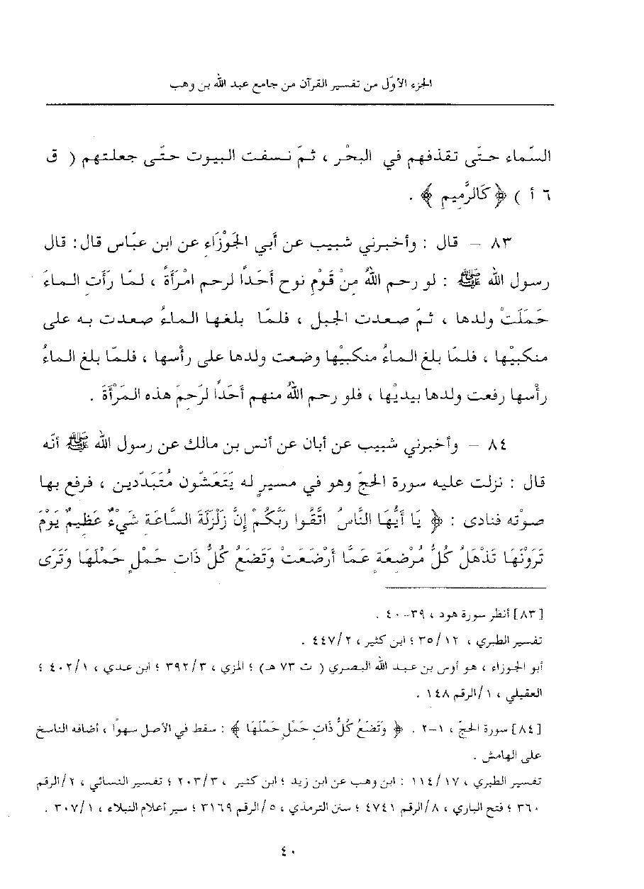 83 - قَالَ: وَأَخْبَرَنِي شَبِيبٌ عَنْ أَبِي الْجَوْزَاءِ، عَنِ ابْنِ عَبَّاسٍ قَالَ: قَالَ رَسُولُ اللَّهِ صَلَّى اللَّهُ عَلَيْهِ وَسَلَّمَ: لَوْ رَحِمَ اللَّهُ مِنْ قَوْمِ نُوحٍ أَحَدًا لَرَحِمَ امْرَأَةً، لَمَّا رَأَتِ الْمَاءَ حَمَلَتْ وَلَدَهَا، ثُمَّ صَعِدَتِ الْجَبَلَ، فَلَمَّا بَلَغَهَا الْمَاءُ صَعِدَتْ بِهِ عَلَى مَنْكِبَيْهَا، فَلَمَّا بَلَغَ الْمَاءُ مَنْكِبَيْهَا وَضَعَتْ وَلَدَهَا عَلَى رَأْسِهَا، فَلَمَّا بَلَغَ الْمَاءُ رَأْسَهَا رَفَعَتْ وَلَدَهَا بِيَدَيْهَا، فَلَوْ رَحِمَ اللَّهُ مِنْهُمْ أَحَدًا لَرَحِمَ هَذِهِ المرأة.