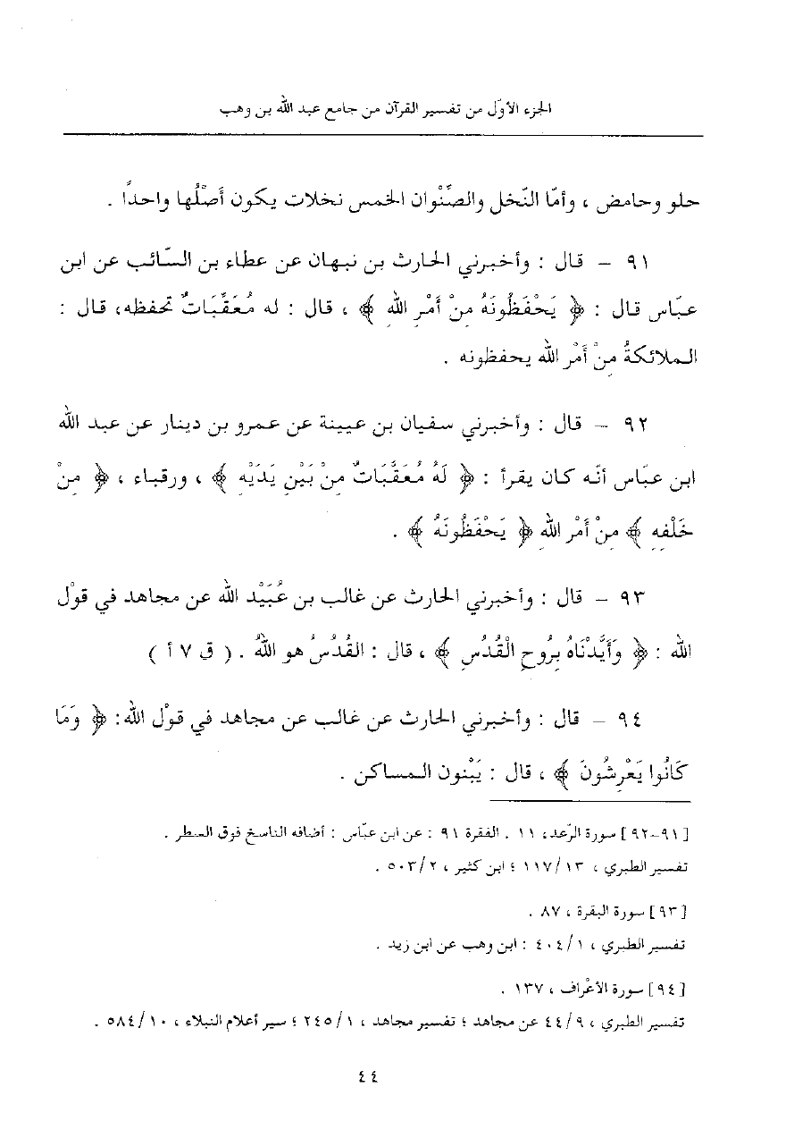 91 - قَالَ: وَأَخْبَرَنِي الْحَارِثُ بْنُ نَبْهَانَ، عَنْ عَطَاءِ بْنِ السَّائِبِ، عَنِ ابْنِ عَبَّاسٍ قَالَ: {يَحْفَظُونَهُ من أمر الله}، قَالَ: لَهُ معقباتٌ تَحْفَظُهُ، قَالَ: الْمَلائِكَةُ مِنْ أَمْرِ اللَّهِ يَحْفَظُونَهُ.