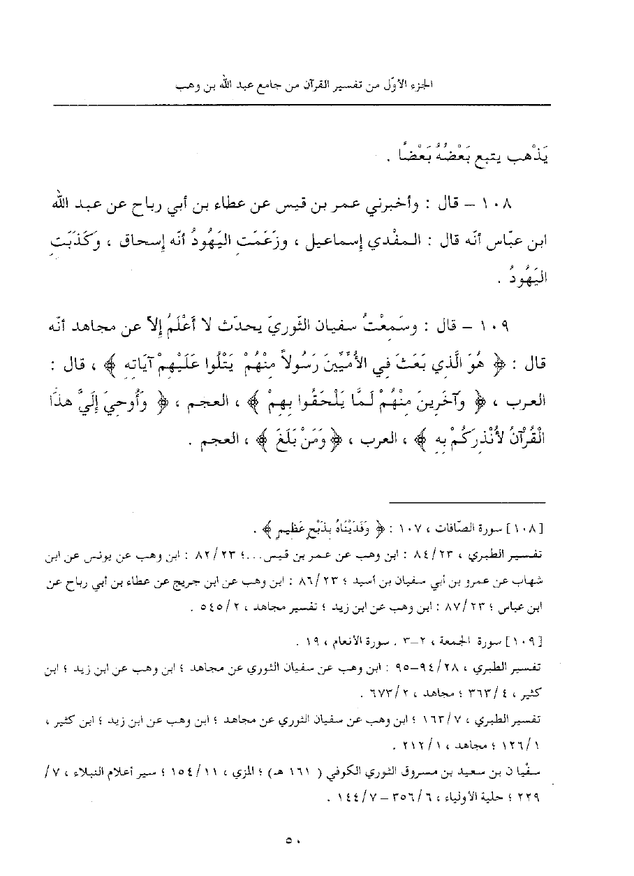 109 - قال: وسمعت سفيان الثوري يحدث لا أعلم إلا عن مجاهد أنه قال: {هو الذي بعث في الأميين رسولا منهم يتلوا عليهم آياته}، قال: العرب: {وآخرين منهم لما يلحقوا بهم}، العجم، {وأوحي إلي هذا القرآن لأنذركم به}، العرب، {ومن بلغ}، العجم.