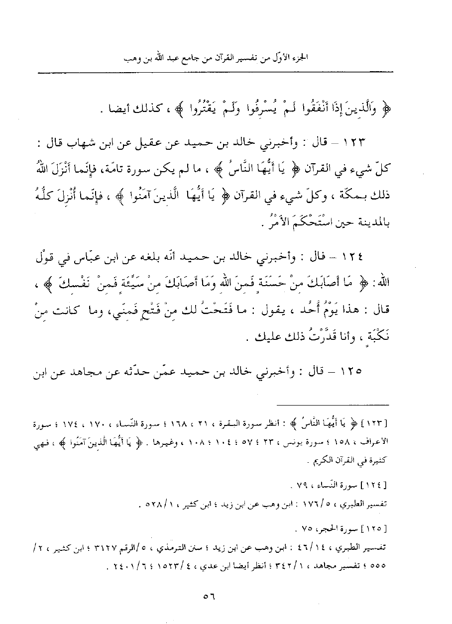 124 - قَالَ: وَأَخْبَرَنِي خَالِدُ بْنُ حُمَيْدٍ أَنَّهُ بَلَغَهُ عَنِ ابْنِ عَبَّاسٍ فِي قَوْلِ اللَّهِ: {مَا أصابك من حسنةٍ فمن الله وما أصابكم من سيئةٍ فمن نفسك}، قَالَ: هَذَا يَوْمُ أُحُدٍ، يَقُولُ: مَا فَتَحْتُ لَكَ مِنْ فتحٍ فَمِنِّي، وَمَا كَانَتْ مِنْ نكبةٍ، وَأَنَا قَدَّرْتُ ذَلِكَ عَلَيْكَ.