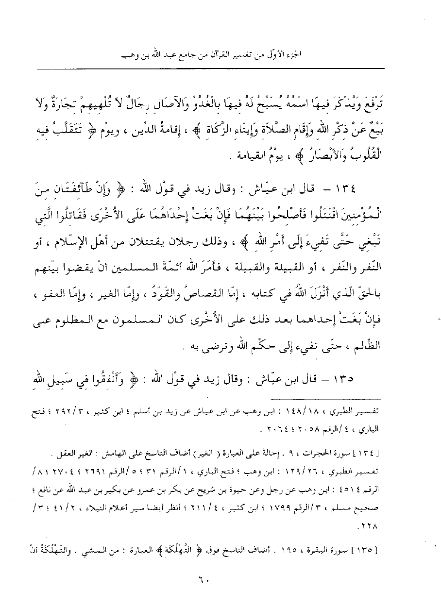 135 - قال ابن عياش: وقال زيد في قول الله: {وأنفقوا في سبيل الله -[61]- ولا تلقوا بأيديكم إلى التهلكة،} وذلك أن رجالا كانوا يخرجون في بعوثٍ يبعثها رسول الله صلى الله عليه وسلم بغير نفقة، فإما يقطع بهم وإما كانوا عيالا، فأمرهم الله أن يستنفقوا مما رزقهم الله ولا يلقوا بأيديهم إلى التهلكة؛ والتهلكة أن يهلك الرجل من الجوع أو العطش أو من المشي؛ ثم قال لمن بيده فضلٌ: {وأحسنوا إن الله يحب المحسنين}.