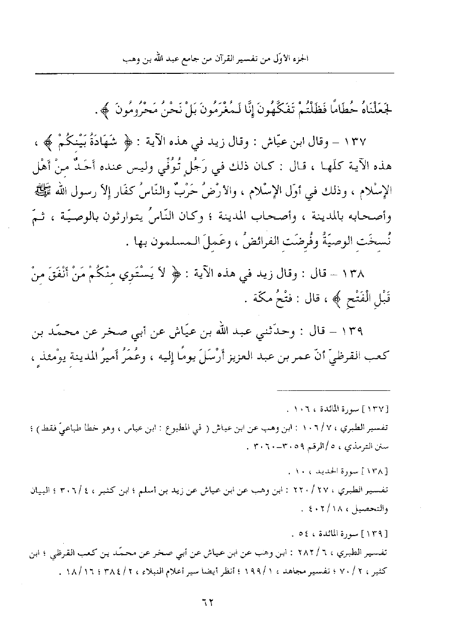 137 - وقال ابن عياش: وقال زيد في هذه الآية: {شهادة بينكم}، هذه الآية كلها، قال: كان ذلك في رجلٍ توفي وليس عنده أحدٌ من أهل الإسلام، وذلك في أول الإسلام، والأرض حربٌ والناس كفار إلا رسول الله صلى الله عليه وسلم وأصحابه بالمدينة، وأصحاب المدينة؛ وكان الناس يتوارثون بالوصية، ثم نسخت الوصية وفرضت الفرائض، وعمل المسلمون بها.