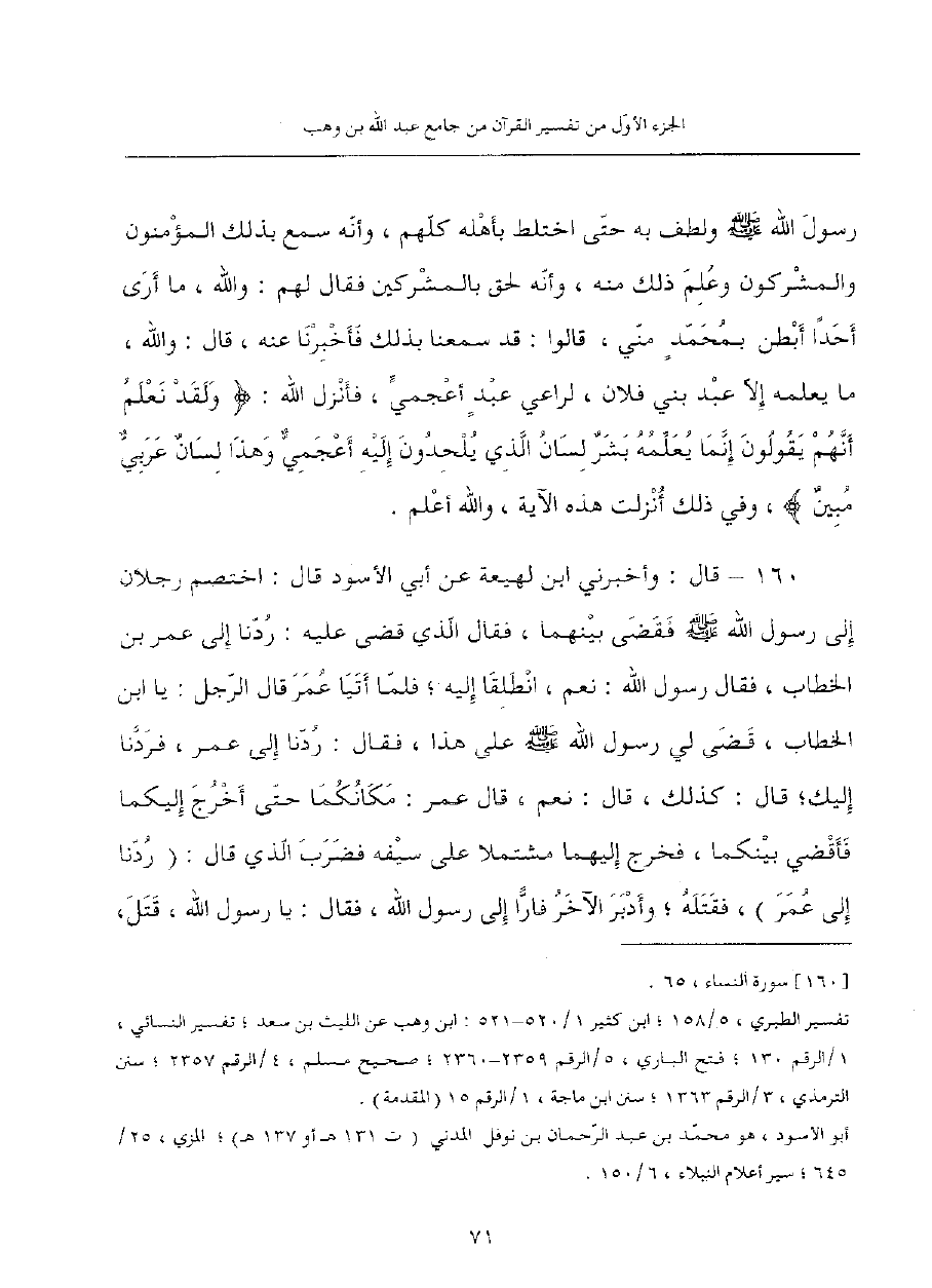 160 - قَالَ: وَأْخَبَرَنِي ابْنُ لَهِيعَةَ عَنْ أَبِي الأَسْوَدِ قَالَ: اخْتَصَمَ رَجُلانِ إِلَى رَسُولِ اللَّهِ صَلَّى اللَّهُ عَلَيْهِ وَسَلَّمَ فَقَضَى بَيْنَهُمَا، فَقَالَ الَّذِي قُضِيَ عَلَيْهِ: رُدَّنَا إِلَى عُمَرَ بْنِ الْخَطَّابِ، فَقَالَ رَسُولُ اللَّهِ: نَعَمْ، انْطَلِقَا إِلَيْهِ؛ فَلَمَّا أتيا عمر قال الرجل: يا ابن الْخَطَّابِ، قَضَى لِي رَسُولُ اللَّهِ صَلَّى اللَّهُ عَلَيْهِ وَسَلَّمَ عَلَى هَذَا، فَقَالَ: رُدَّنَا إِلَى عُمَرَ، فَرَدَّنَا إِلَيْكَ؛ قَالَ: كَذَلِكَ، قَالَ: نَعَمْ، قَالَ عُمَرُ: مَكَانَكُمَا حَتَّى أَخْرُجَ إِلَيْكُمَا فَأَقْضِيَ بَيْنَكُمَا، فَخَرَجَ إِلَيْهِمَا مُشْتَمِلا عَلَى سَيْفِهِ فَضَرَبَ الَّذِي قَالَ: (رُدَّنَا إِلَى عُمَرَ)، فَقَتَلَهُ؛ وَأَدْبَرَ الآخَرُ فَارًّا إِلَى رَسُولِ اللَّهِ، فَقَالَ: يَا رَسُولَ اللَّهِ، قَتَلَ، -[72]- وَاللَّهِ، عُمَرُ صَاحِبِي، وَلَوْ مَا أَنِّي أَعْجَزْتُهُ لَقَتَلَنِي، فَقَالَ رَسُولُ اللَّهِ: مَا كُنْتُ أَظُنُّ أَنْ يَجْتَرِئَ عُمَرُ عَلَى قَتْلِ مؤمنٍ، فَأَنْزَلَ اللَّهُ: {فَلا وَرَبِّكَ لا يُؤْمِنُونَ حَتَّى يُحَكِّمُوكَ فِيمَا شَجَرَ بَيْنَهُمْ ثُمَّ لا يَجِدُوا فِي أَنْفُسِهِمْ حَرَجًا مِمَّا قَضَيْتَ ويسلموا تسليماً}، فَهُدِرَ دَمُ ذَلِكَ الرَّجُلِ وَبُرِّئَ عُمَرُ مِنْ قَتْلِهِ، وَكَرِهَ اللَّهُ أَنْ يُسَنَّ ذَلِكَ بَعْدُ، فَقَالَ: {وَلَوْ أَنَّا كَتَبْنَا عَلَيْهِمْ أَنِ اقْتُلُوا أَنْفُسَكُمْ أَوِ اخْرُجُوا مِنْ دِيَارِكُمْ مَا فَعَلُوهُ إِلا قليلٌ مِنْهُمْ وَلَوْ أَنَّهُمْ فَعَلُوا مَا يُوعَظُونَ بِهِ لَكَانَ خَيْرًا لَهُمْ وَأَشَدَّ تَثْبِيتًا}.