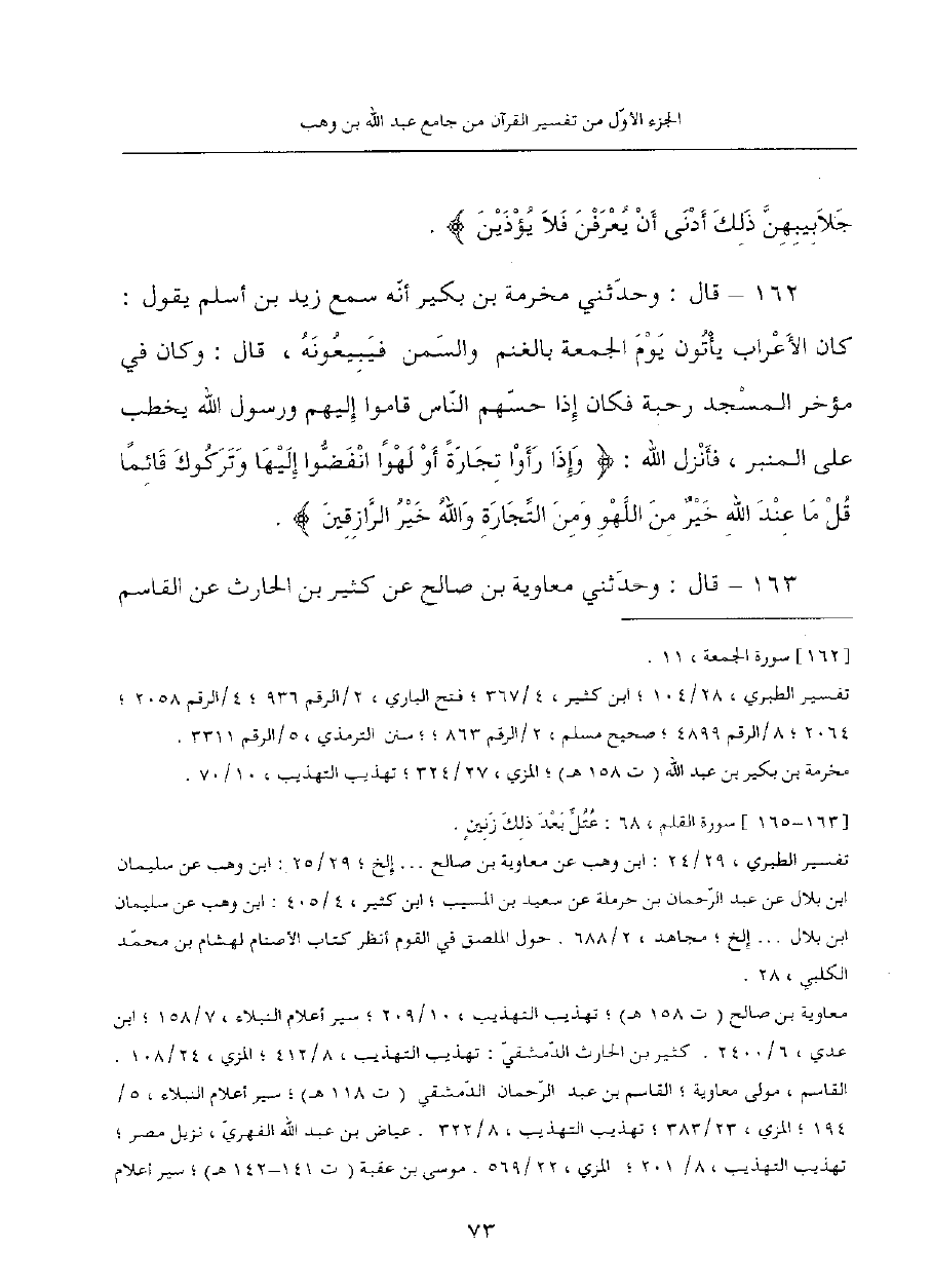 162 - قَالَ: وَحَدَّثَنِي مَخْرَمَةُ بْنُ بُكَيْرٍ أَنَّهُ سَمِعَ زَيْدَ بْنَ أَسْلَمَ يَقُولُ: كَانَ الأَعْرَابُ يَأْتُونَ يَوْمَ الْجُمُعَةِ بِالْغَنَمِ وَالسَّمْنِ فَيَبِيعُونَهُ، قَالَ: وَكَانَ في مؤخر المسجد رحبة فكان إذا حسهم النَّاسُ قَامُوا إِلَيْهِمْ وَرَسُولُ اللَّهِ يَخْطُبُ عَلَى الْمِنْبَرِ، فَأَنْزَلَ اللَّهُ: {وَإِذَا رَأَوْا تِجَارَةً أَوْ لَهْوًا انْفَضُّوا إِلَيْهَا وَتَرَكُوكَ قَائِمًا قُلْ مَا عِنْدَ اللَّهِ خيرٌ مِنَ اللَّهْوِ وَمِنَ التِّجَارَةِ والله خير الرازقين}.