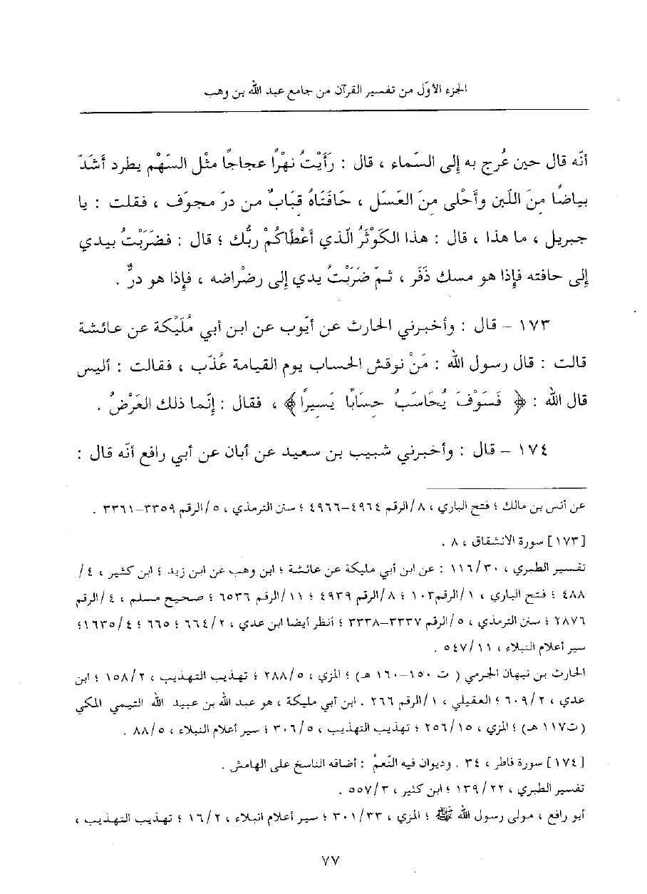 173 - قَالَ: وَأَخْبَرَنِي الْحَارِثُ، عَنْ أَيُّوبَ، عَنِ ابْنِ أَبِي مُلَيْكَةَ، عَنْ عَائِشَةَ قَالَتْ: قَالَ رَسُولُ الله: مَنْ نُوقِشَ الْحِسَابَ يَوْمَ الْقِيَامَةِ عُذِّبَ، فَقَالَتْ: أَلَيْسَ قَالَ اللَّهُ: {فَسَوْفَ يُحَاسَبُ حِسَابًا يَسِيرًا}، فَقَالَ: إِنَّمَا ذَلِكَ الْعَرْضُ.