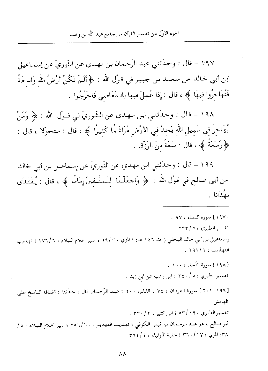 198 - قال: وحدثني ابن مهدي، عن الثوري في قول الله: {ومن يهاجر في سبيل الله يجد في الأرض مراغما كثيرا}، قال: متحولا، قال: {وسعة}، قال: سعةً من الرزق.