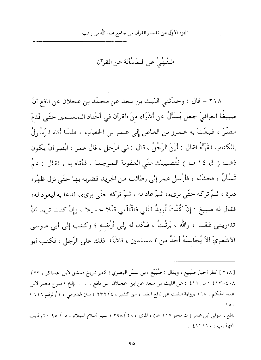 218 - قَالَ: وَحَدَّثَنِي اللَّيْثُ بْنُ سَعْدٍ، عَنْ مُحَمَّدِ بْنِ عَجْلانَ، عَنْ نَافِعٍ أَنَّ صَبِيغًا الْعِرَاقِيَّ جَعَلَ يَسْأَلُ عَنْ أَشْيَاءَ مِنَ الْقُرْآنِ فِي أَجْنَادِ الْمُسْلِمِينَ حَتَّى قَدِمَ مِصْرَ، فَبَعَثَ بِهِ عَمْرُو بْنُ الْعَاصِ إِلَى عُمَرَ بْنِ الْخَطَّابِ، فَلَمَّا أَتَاهُ الرَّسُولُ بِالْكِتَابِ فَقَرَأَهُ فَقَالَ: أَيْنَ الرَّجُلُ، قَالَ: فِي الرَّحْلِ، قَالَ عُمَرُ: أَبْصِرْ أَنْ يَكُونَ ذَهَبَ فَتُصِيبَكَ مِنِّي الْعُقُوبَةُ الْمُوجِعَةُ، فَأَتَاهُ بِهِ، فَقَالَ: عَمَّ تَسْأَلُ، فَحَدَّثَهُ، فَأَرْسَلَ عُمَرُ إِلَى رَطَائِبَ مِنَ الْجَرِيدِ فَضَرَبَهُ بِهَا حَتَّى نَزَلَ ظَهْرُهُ دُبُرَهُ، ثُمَّ تَرَكَهُ حَتَّى بَرِئَ، ثُمَّ عَادَ لَهُ، ثُمَّ تَرَكَهُ حَتَّى بَرِئَ، فَدَعَا بِهِ لِيَعُودَ لَهُ، فَقَالَ لَهُ صَبِيغٌ: إِنْ كُنْتَ تُرِيدُ قَتْلِي فَاقْتُلْنِي قَتْلا جَمِيلا، وَإِنْ كُنْتَ تُرِيدُ أَنْ تُدَاوِيَنِي فَقَدْ، وَاللَّهِ، بَرِئْتُ، فَأَذِنَ لَهُ إِلَى أَرْضِهِ؛ وَكَتَبَ إِلَى أَبِي مُوسَى الأَشْعَرِيِّ أَلا يُجَالِسُهُ أحدٌ مِنَ الْمُسْلِمِينَ، فَاشْتَدَّ ذَلِكَ عَلَى الرَّجُلِ، فَكَتَبَ أَبُو -[96]- مُوسَى إِلَى عُمَرَ بْنِ الْخَطَّابِ أَنْ قَدْ حَسُنَتْ هَيْئَتُهُ، فَكَتَبَ إِلَيْهِ عُمَرُ أَنِ ائْذَنْ لِلنَّاسِ بمجالسته.