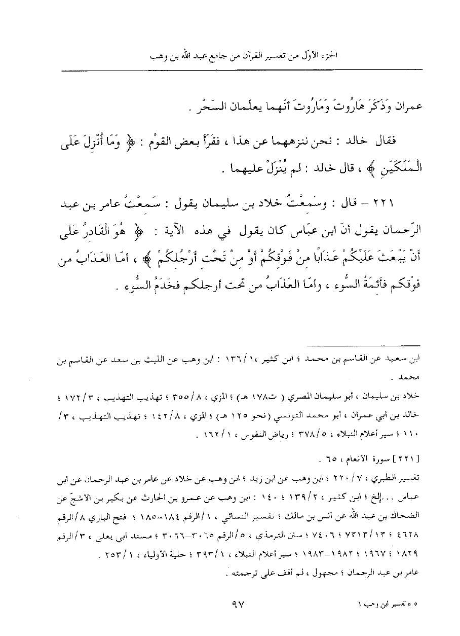 221 - قال: وسمعت خلاد بن سليمان يقول: سمعت عَامِرَ بْنَ عَبْدِ الرَّحْمَنِ يَقُولُ: إِنَّ ابْنَ عَبَّاسٍ كَانَ يَقُولُ فِي هَذِهِ الآيَةِ: {هُوَ الْقَادِرُ عَلَى أَنْ يَبْعَثَ عَلَيْكُمْ عَذَابًا مِنْ فوقكم أو من تحت أرجلكم}، أما الْعَذَابُ مِنْ فَوْقِكُمْ فَأَئِمَّةُ السُّوءِ، وَأَمَّا الْعَذَابُ مِنْ تَحْتِ أَرْجُلِكُمْ فَخَدَمُ السُّوءِ.