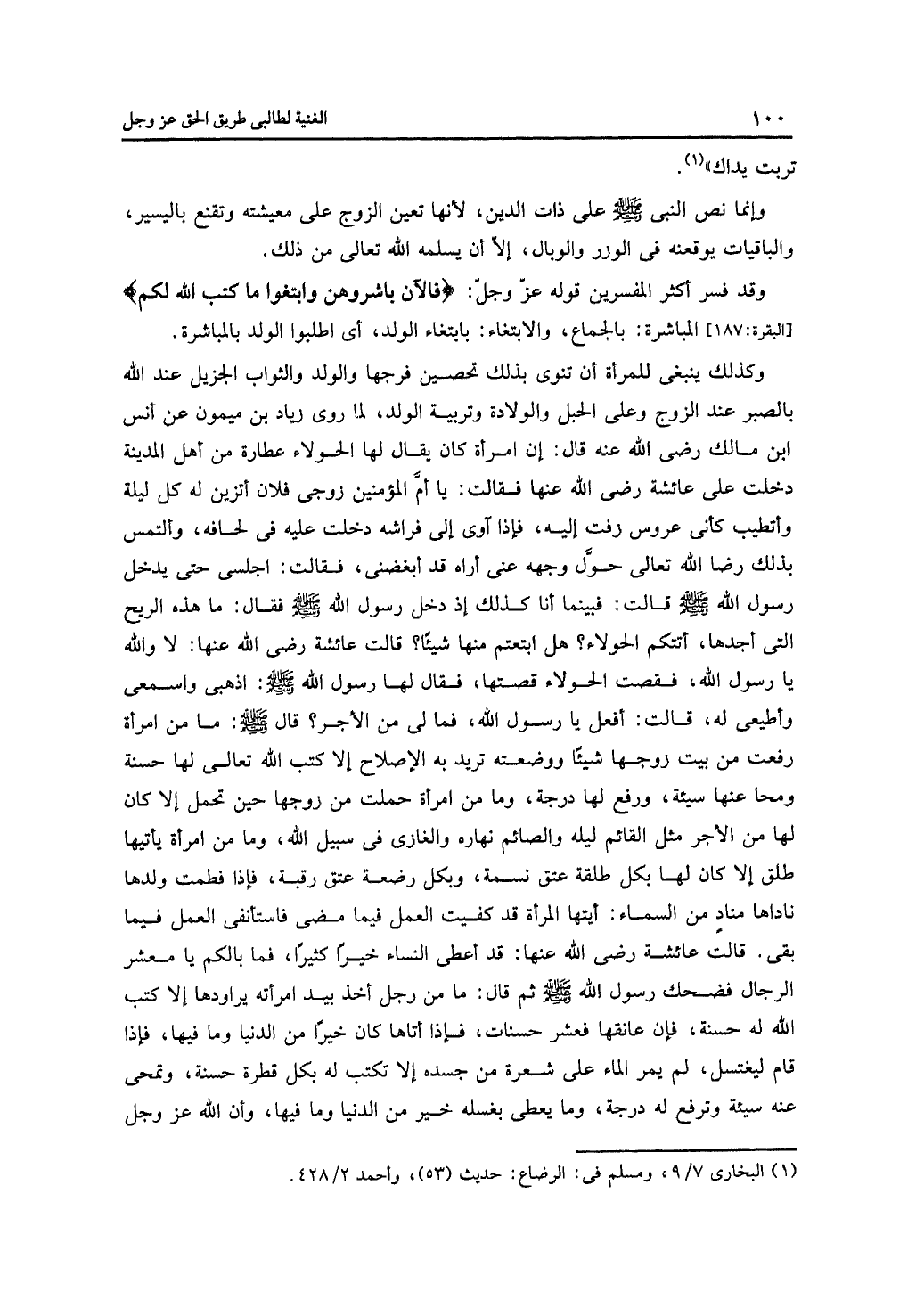 وكذلك ينبغي للمرأة أن تنوي بذلك تحصين فرجها والولد والثواب الجزيل عند الله بالصبر عند الزوج وعلى الحبل والولادة وتربية الولد، لما روى زياد بن ميمون عن أنس ابن مالك رضي الله عنه قال: إن امرأة كان يقال لها الحولاء عطارة من أهل المدينة دخلت على عائشة رضي الله عنها فقال: يا أم المؤمنين زوجي فلان أتزين له كل ليلة وأتطيب كأني عروس زفت إليه، فإذا آوى إلى فراشه دخلت عليه في لحافه، وألتمس بذلك رضا الله تعالى حول وجهه عني أراه قد أبغضني، فقالت: اجلسي حتى يدخل رسول الله- صلى الله عليه وسلم- قالت: فبينما أنا كذلك إذ دخل رسول الله- صلى الله عليه وسلم- فقال: ما هذه الريح التي أجدها، أتتكم الحولاء؟ هل ابتعتم منها شيئًا؟ قالت عائشة رضي الله عنها: لا والله يا رسول الله، فقصت الحولاء قصتها، فقال لها رسول الله- صلى الله عليه وسلم-: اذهبي واسمعي وأطيعي له، قالت: أفعل يا رسول الله، فما لي من الأجر؟ قال- صلى الله عليه وسلم-: ما من امرأة رفعت من بيت زوجها شيئًا ووضعته تريد به الإصلاح إلا كتب الله تعالى له حسنة ومحا عنها سيئة، ورفع لها درجة، وما من امرأة حملت من زوجها حين تحمل إلا كان لها من الأجر مثل القائم ليلة والصائم نهاره والغازي في سبيل الله، وما من امرأة يأتيها طلق إلا كان لها بكل طلقة عتق نسمة، وبكل رضعة عتق رقبة، فإذا فطمت ولدها ناداها منادٍ من السماء: أيتها المرأة قد كفيت العمل فيما مضى فاستأنفي العمل فيما بقى. قالت عائشة رضي الله عنها: قد أعطى النساء خيرًا كثيرًا، فما بالكم يا معشر الرجال فضحك رسول الله- صلى الله عليه وسلم- ثم قال: ما من رجل أخذ بيد امرأته يراودها إلا كتب الله له حسنة، فإن عانقها فعشر حسنات، فإذا أتاها كان خيرًا من الدنيا وما فيها، فإذا قام ليغتسل، لم يمر الماء على شعرة من جسده إلا تكتب له بكل قطرة حسنة، وتمحى عنه سيئة وترفع له درجة، وما يعطى بغسله خير من الدنيا وما فيها، وأن الله عز وجل