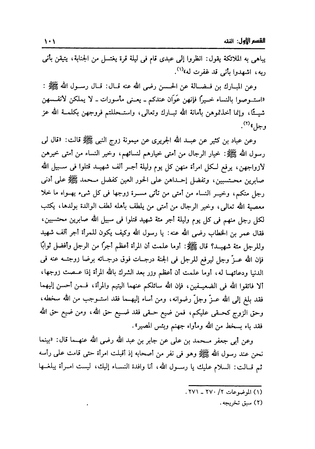 وعن أبي جعفر محمد بن علي عن جابر بن عبد الله رضي الله عنهما قال: ((بينما نحن عند رسول الله- صلى الله عليه وسلم- وهو في نفر من أصحابه إذا أقبلت امرأة حتى قامت على رأسه ثم قالت: السلام عليك يا رسول الله، أنا وافدة النساء إليك، ليست امرأة يبلغها