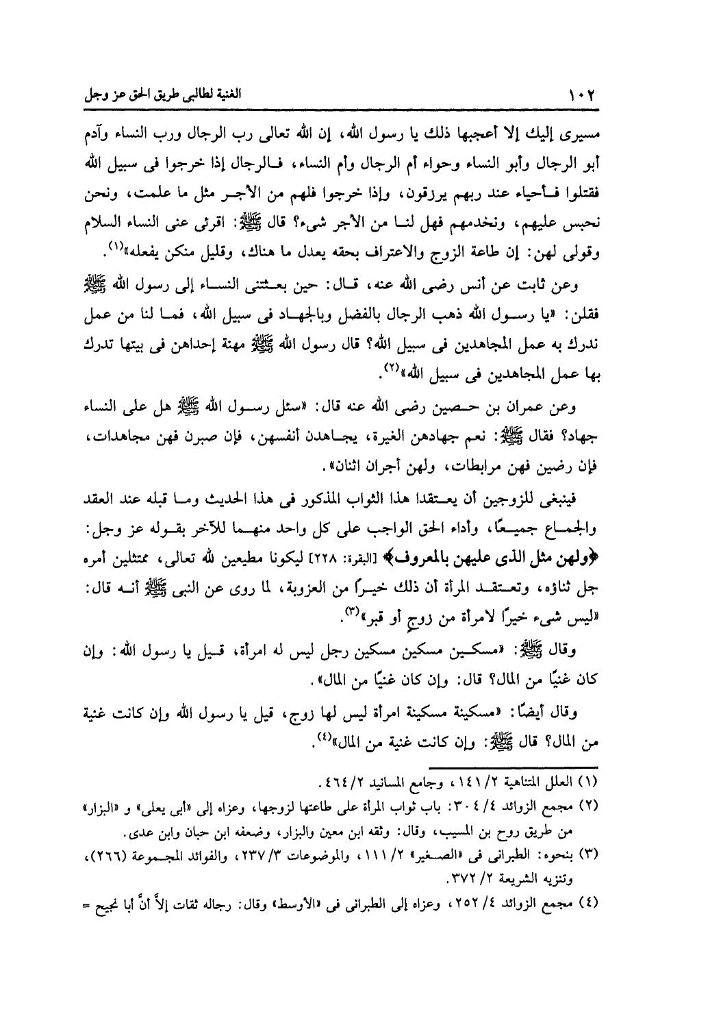 وعن ثابت عن أنس رضي الله عنه، قال: حين بعثتني النساء إلى رسول الله- صلى الله عليه وسلم- فقلن: ((يا رسول الله ذهب الرجال بالفضل وبالجهاد في سبيل الله، فما لنا من عمل ندرك به عمل المجاهدين في سبيل الله؟ قال رسول الله- صلى الله عليه وسلم- مهنة إحداهن في بيتها تدرك بها عمل المجاهدين في سبيل الله)).