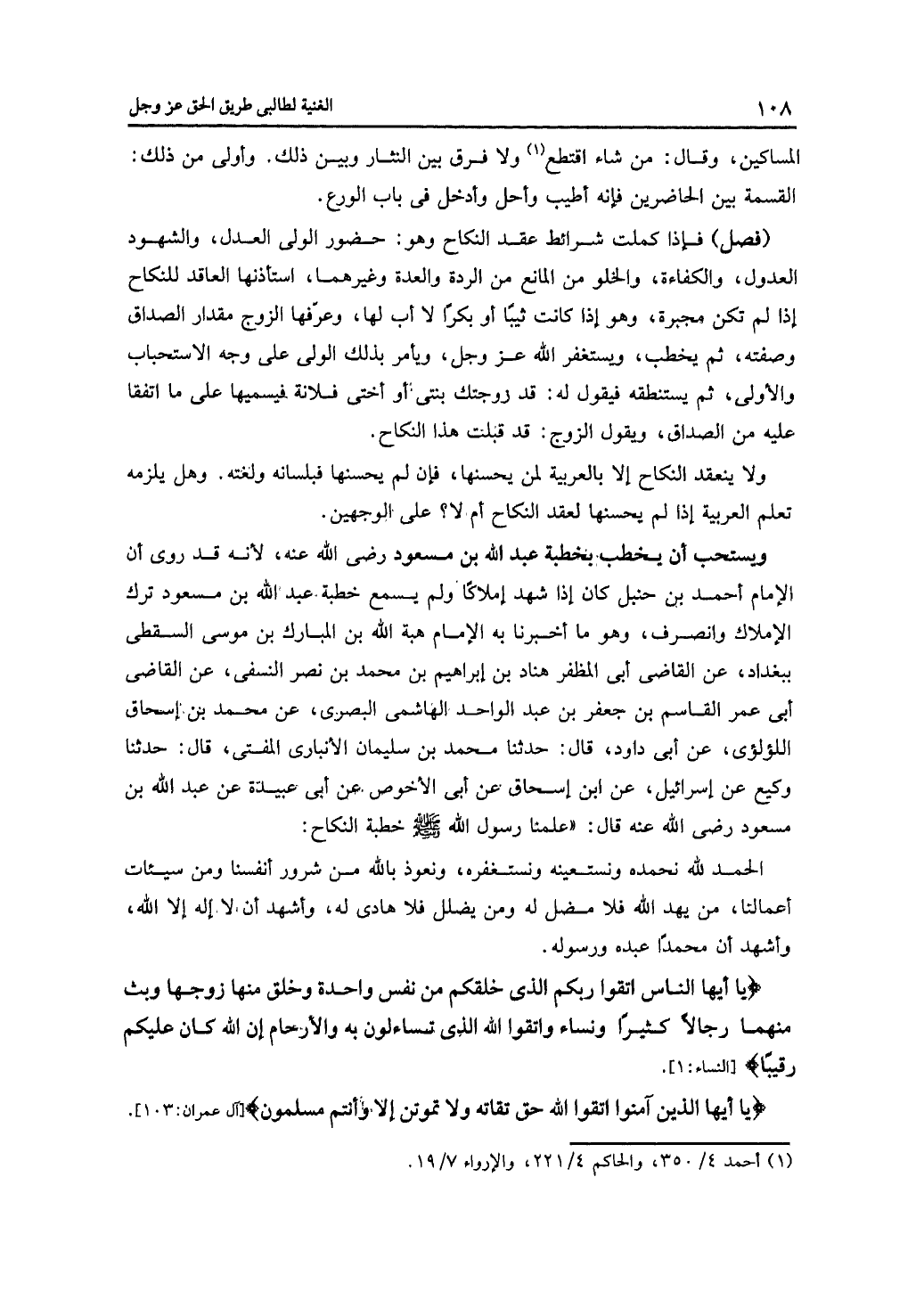 ويستحب أن يخطب بخطبة عبد الله بن مسعود رضي الله عنه، لأنه قد روى أن الإمام أحمد بن حنبل كان إذا شهد إملاكًا ولم يسمع خطبة عبد الله بن مسعود ترك الإملاك وانصرف، وهو ما أخبرنا به الإمام هبة الله بن المبارك بن موسى السقطي ببغداد، عن القاضي أبي المظفر هناد بن إبراهيم بن محمد بن نصر النسفي، عن القاضي أبي عمر القاسم بن جعفر بن عبد الواحد الهاشمي البصري، عن محمد بن إسحاق اللؤلؤي، عن أبي داود، قال: حدثنا محمد بن سليمان الأنباي المفتي، قال: حدثنا وكيع عن إسرائيل، عن ابن إسحاق عن أبي الأخوص عن أبي عبيدة عن عبد الله بن مسعود رضي الله عنه قال: ((علمنا رسول الله- صلى الله عليه وسلم- خطبة النكاح:
