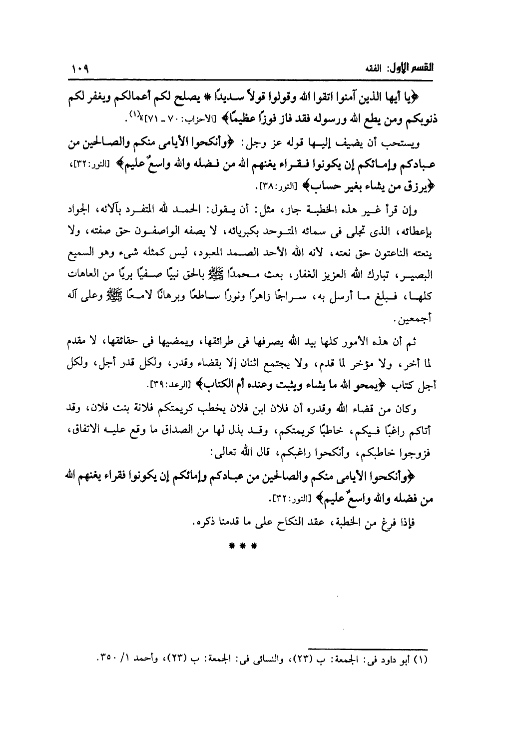 وكان من قضاء الله وقدره أن فلان ابن فلان يخطب كريمتكم فلانة بنت فلان، وقد أتاكم راغبًا فيكم، خاطبًا كريمتكم، وقد بذل لها من الصداق ما وقع عليه الاتفاق، فزوجوا خاطبكم، وأنكحوا راغبكم، قال الله تعالى: