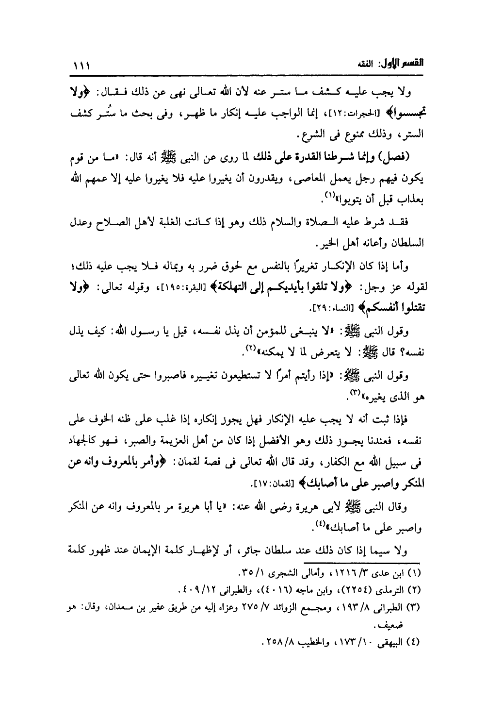 (فصل) وإنما شرطنا القدرة على ذلك ما روى عن النبي- صلى الله عليه وسلم- أنه قال: ((ما من قوم يكون فيهم رجل يعمل المعاصي، ويقدرون أن يغيروا عليه فلا يغيروا عليه إلا عمهم الله بعذاب قبل أن يتوبوا)).