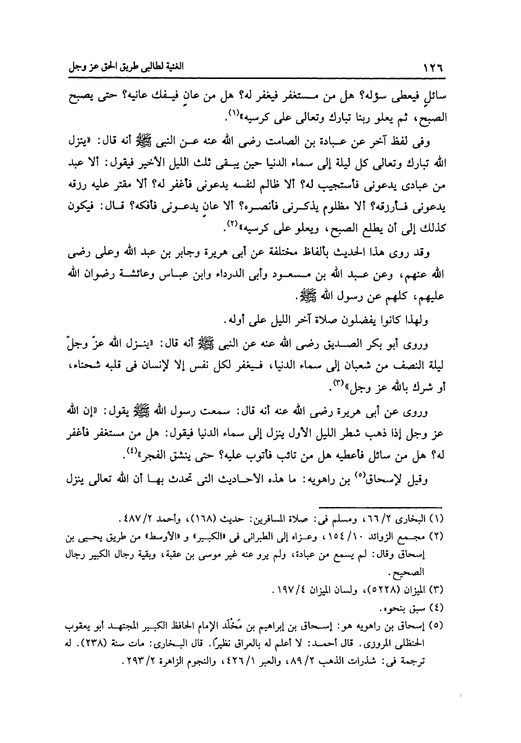 وفي لفظ آخر عن عباده بن الصامت رضي الله عنه عن النبي- صلى الله عليه وسلم- أنه قال: ((ينزل الله تبارك وتعالى كل ليلة إلى سماء الدنيا حين يبقى ثلث الليل الأخير فيقول: ألا عبد من عبادي يدعوني فأستجيب له؟ ألا ظالم لنفسه يدعوني فأغفر له؟ ألا مقتر عليه رزقه يدعوني فأرزقه؟ ألا مظلوم يذكرني فأنصره؟ ألا عان يدعوني فأفكه؟ قال: فيكون كذلك إلى أن يطلع الصبح، ويعلو على كرسيه)).