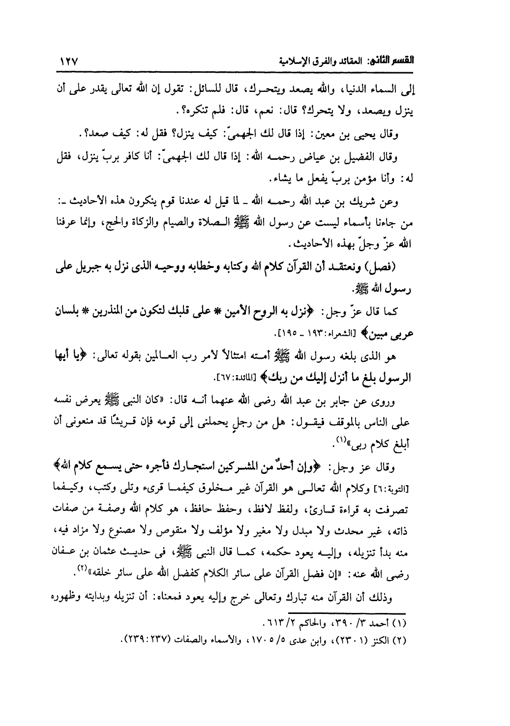 (فصل) ونعتقد أن القرآن كلام الله كتابه وخطابه ووحيه الذي نزل به جبريل على رسول الله- صلى الله عليه وسلم-.