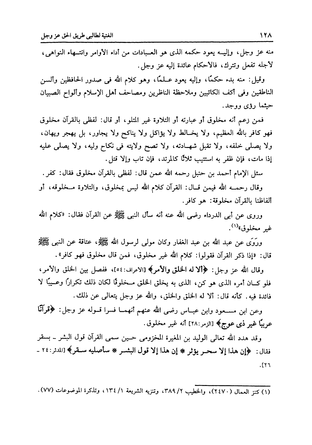 وعن ابن مسعود وابن عباس رضي الله عنهم أنهما فسرا قوله عز وجل: {قرآنًا عربيًا غير ذي عوج} [الزمر: 28] أنه غير مخلوق.