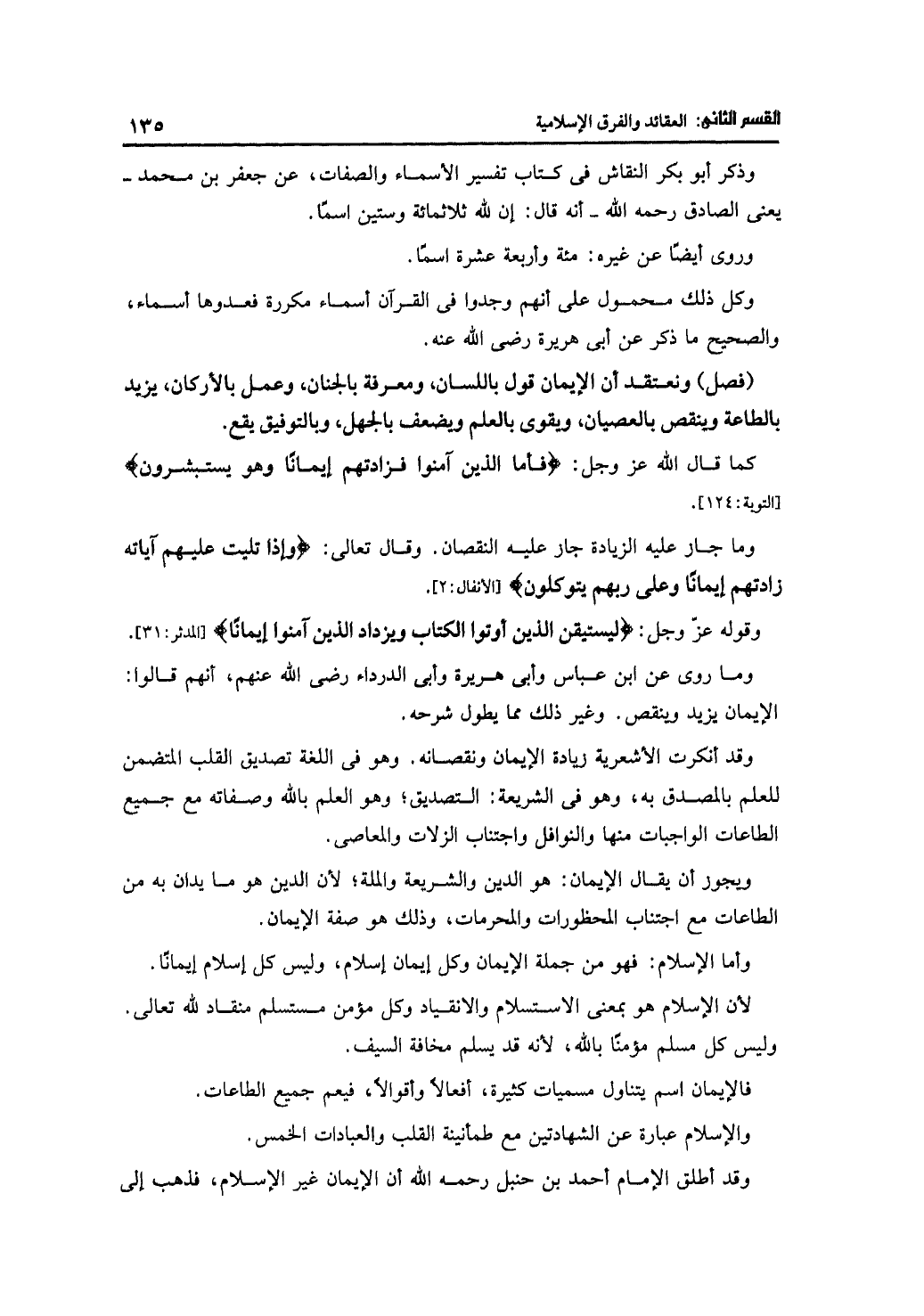 (فصل) ونعتقد أن الإيمان قول باللسان، ومعرفة بالجنان، وعمل بالأركان، يزيد بالطاعة وينقص بالعصيان، ويقوى بالعلم ويضعف بالجهل، وبالتوفيق يقع.