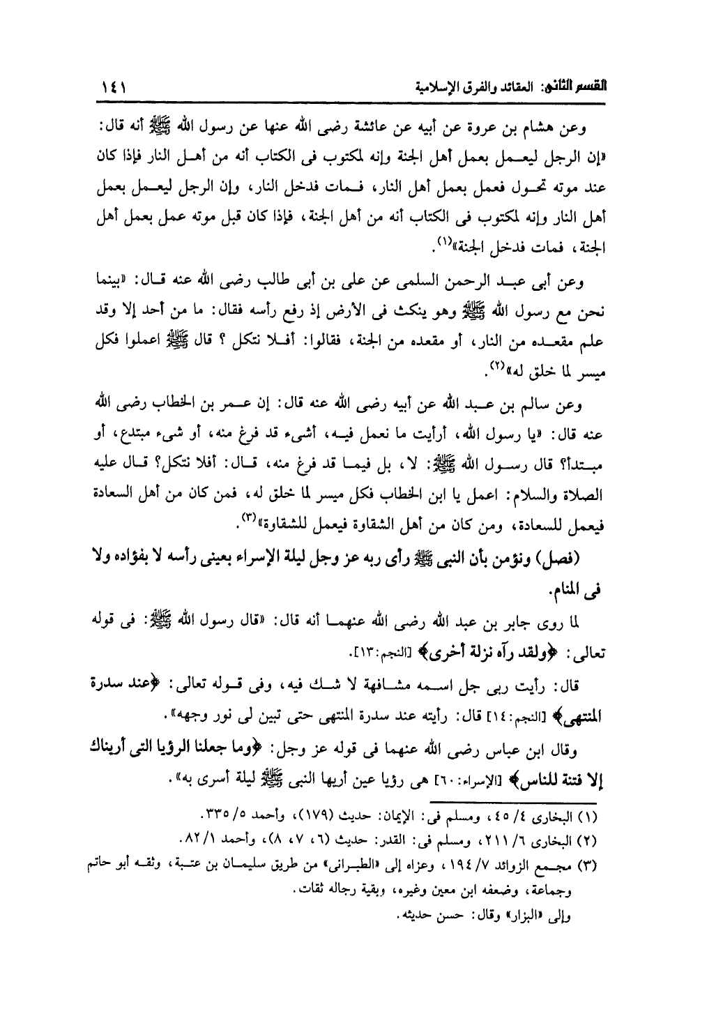 (فصل) ونؤمن بأن النبي -صلى الله عليه وسلم- رأى ربه -عز وجل- ليلة الإسراء بعيني رأسه لا بفؤاده ولا في المنام.