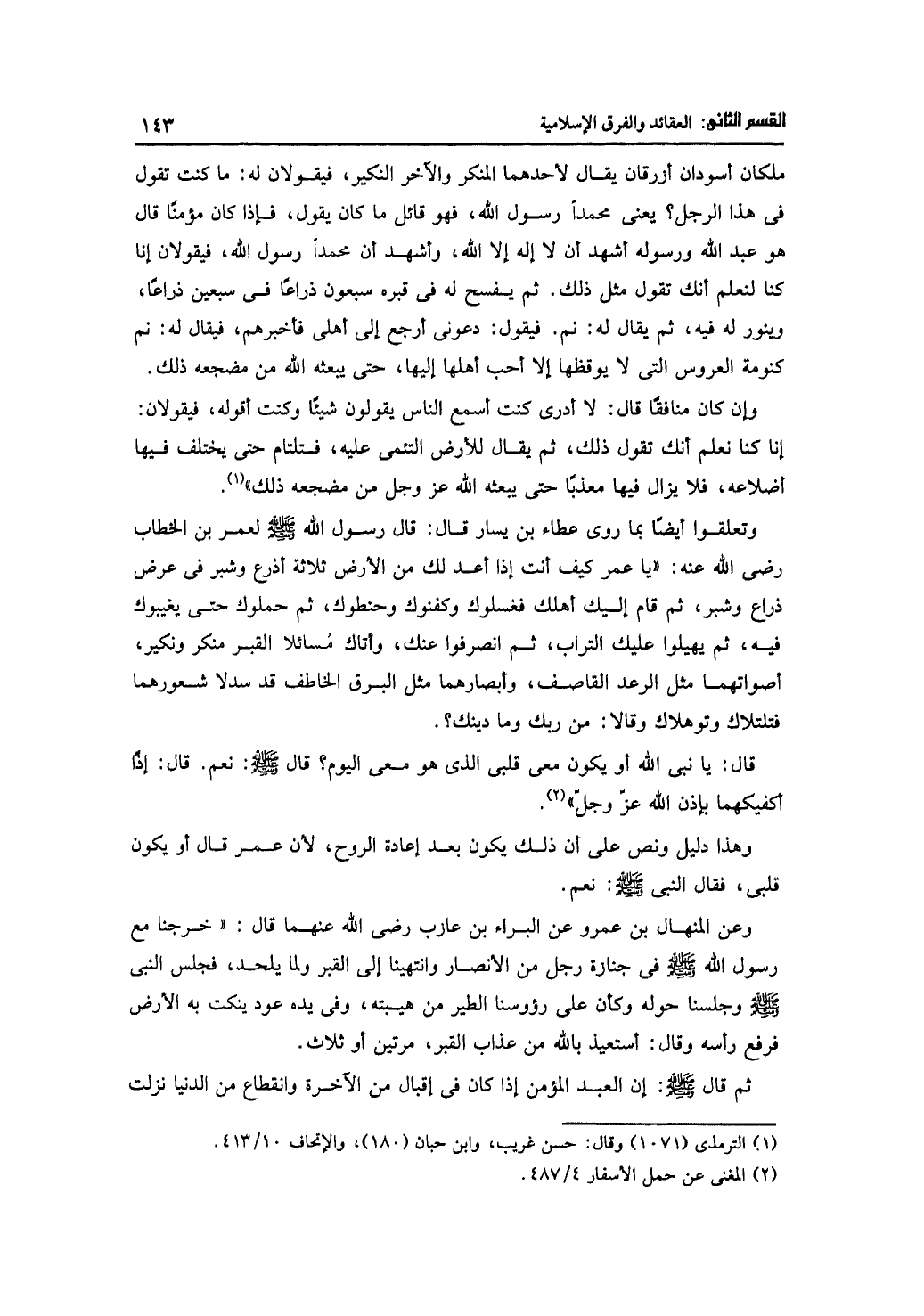 ملكان أسودان أزرقان يقال لأحدهما المنكر والآخر النكير، فيقولان له: ما كنت تقول في هذا الرجل؟ يعني محمدًا رسول الله، فهو قائل ما كان يقول، فإذا كان مؤمنًا قال هو عبد الله ورسوله أشهد أن لا إله إلا الله، وأشهد أن محمدًا رسول الله، فيقولان إنا كنا لنعلم أنك تقول مثل ذلك. ثم يفسح له في قبره سبعون ذراعًا في سبعين ذراعًا، وينور له فيه، ثم يقال له: نم. فيقول: دعوني أرجع إلى أهلي فأخبرهم، فيقال له: نم كنومة العروس التي لا يوقظها إلا أحب أهلها إليها، حتى يبعثه الله من مضجعه ذلك.