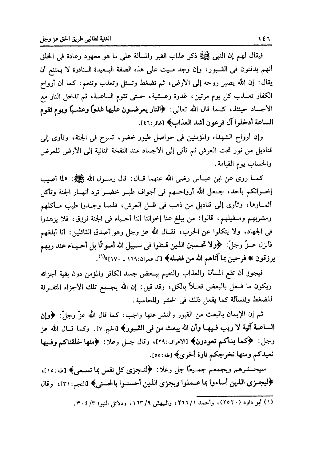 وإن أرواح الشهداء والمؤمنين في حواصل طيور خضر، تسرح في الجنة، وتأوى إلى قناديل من نور تحت العرش ثم تأتي إلى الأجساد عند النفخة الثانية إلى الأرض للعرض والحساب يوم القيامة.