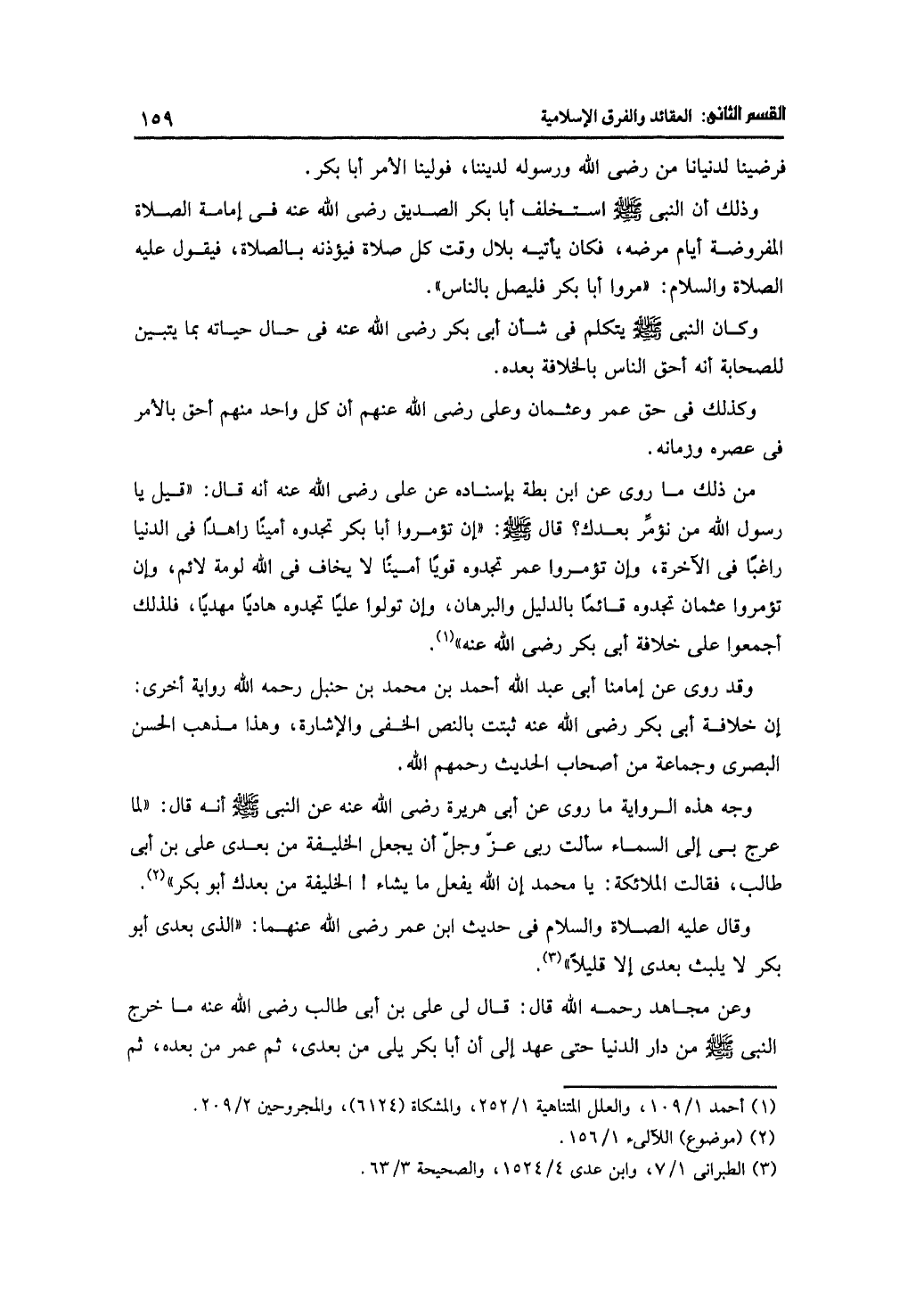 وقد روي عن إمامنا أبي عبد الله أحمد بن محمد بن حنبل -رحمه الله- رواية أخرى: إن خلافة أبي بكر -رضي الله عنه- ثبتت بالنص الخفي والإشارة، وهذا مذهب الحسن البصري وجماعة من أصحاب الحديث -رحمهم الله-.