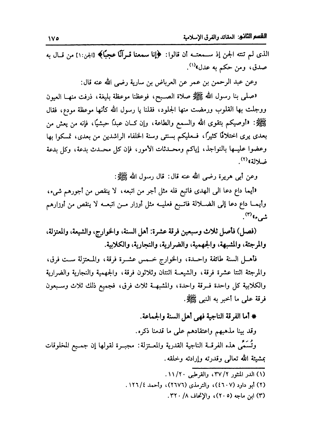 فأهل السنة طائفة واحدة، والخوارج خمس عشرة فرقة، والمعتزلة ست فرق، والمرجئة اثنتا عشرة فرقة، والشيعة اثنتان وثلاثون فرقة، والجهمية والنجارية والضرارية والكلابية كل واحدة فرقة واحدة، والمشبهة ثلاث فرق، فجميع ذلك ثلاث وسبعون فرقة على ما أخبر به النبي -صلى الله عليه وسلم-.