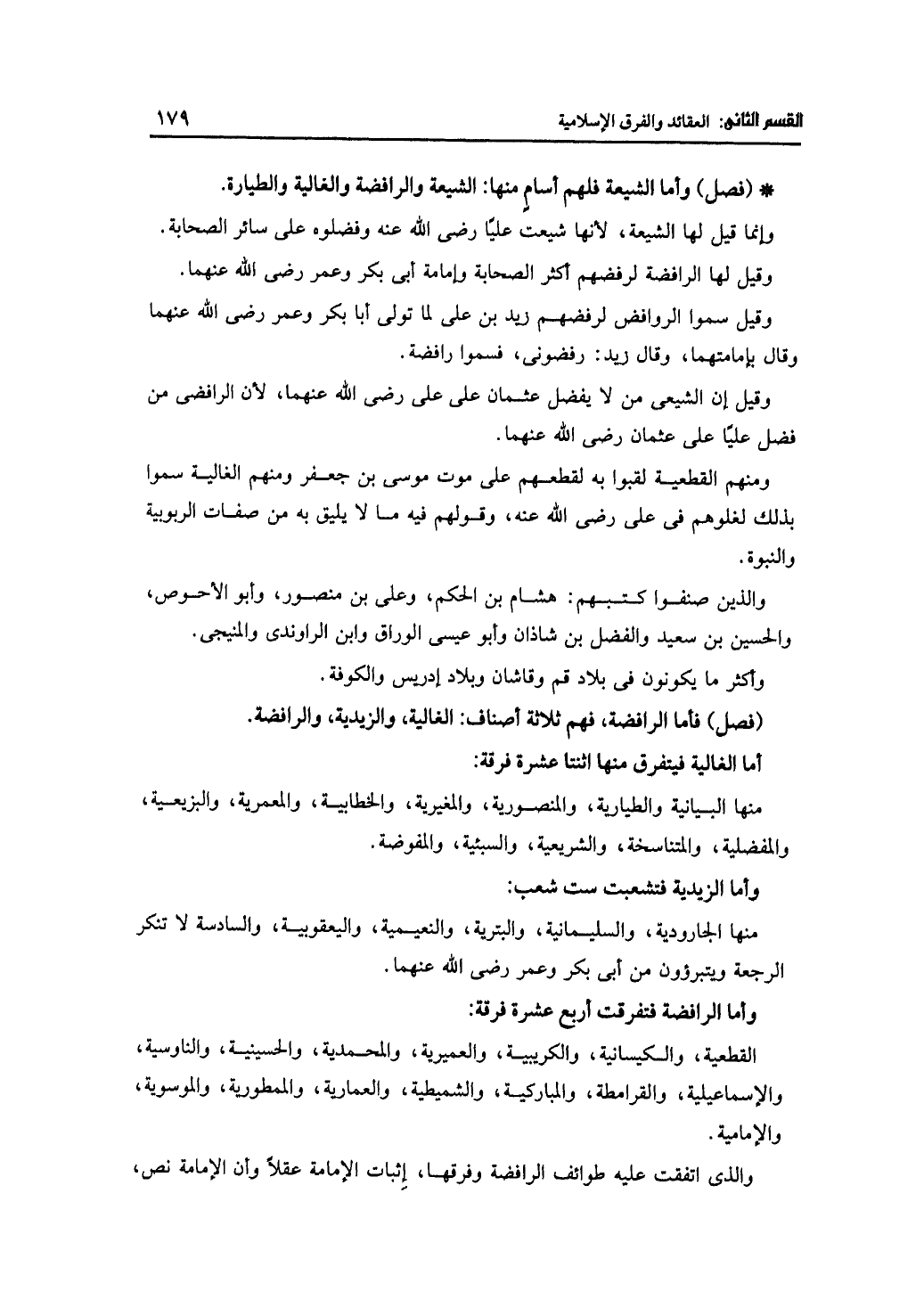* (فصل) وأما الشيعة فلهم أسام منها: الشيعة والرافضة والغالية والطيارة.