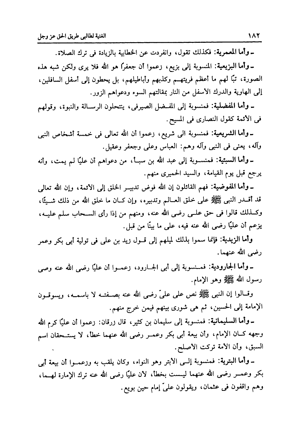 - وأما البترية: فمنسوبة إلى الأبتر وهو النواء، وكان يلقب به وزعموا أن بيعة أبي بكر وعمر -رضي الله عنهما- ليست بخطأ، لأن عليًا -رضي الله عنه- ترك الإمارة لهما، وهم واقفون في عثمان، ويقولون علي إمام حين بويع.