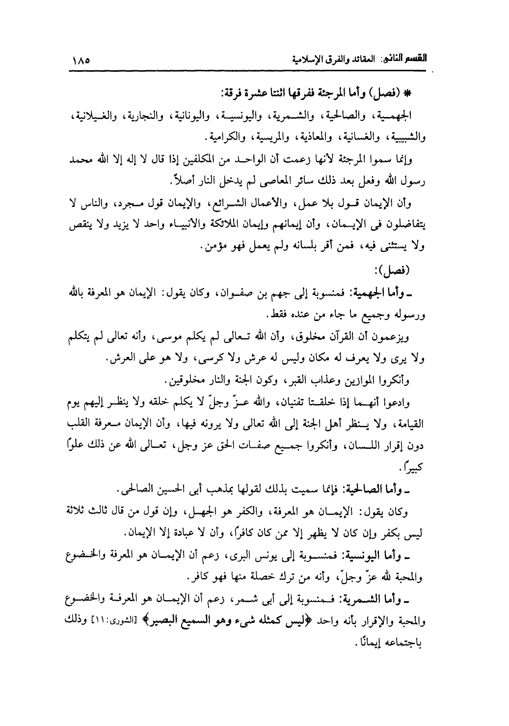 * (فصل) وأما المرجئة ففرقها اثنتا عشرة فرقة: