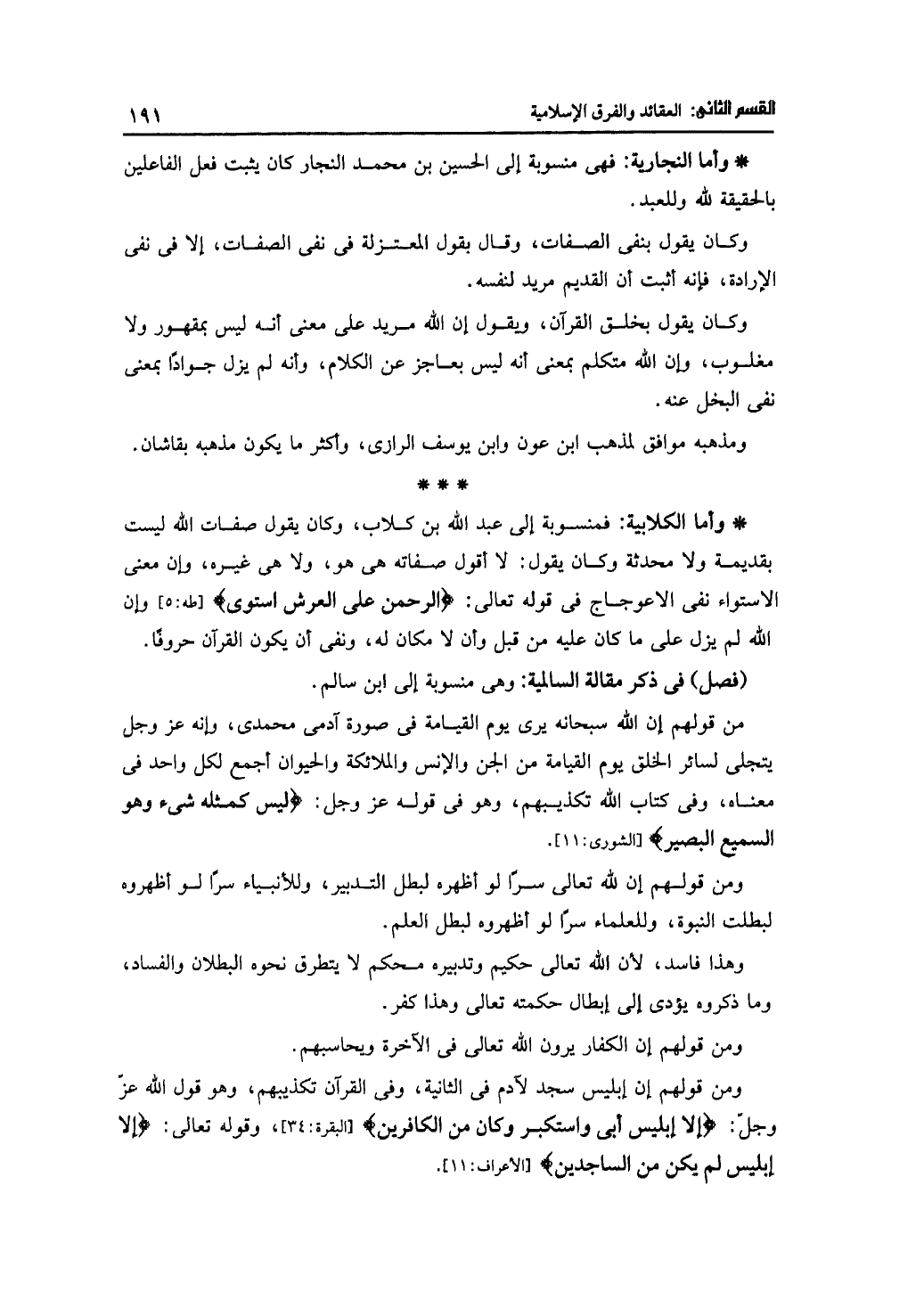 - وأما النجارية: فهي منسوبة إلى الحسين بن محمد النجار كان يثبت فعل الفاعلين بالحقيقة لله وللعبد.