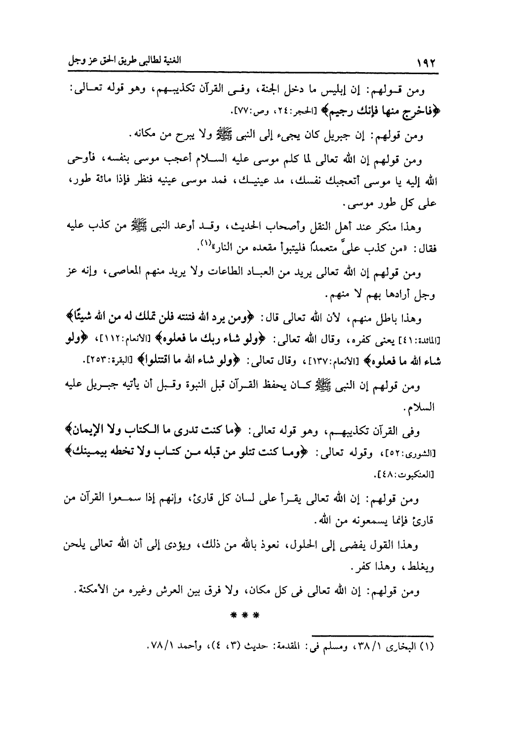 ومن قولهم: إن إبليس ما دخل الجنة، وفي القرآن تكذيبهم، وهو قوله تعالى: {فاخرج منها فإنك رجيم} [الحجر: 24، وص: 77].