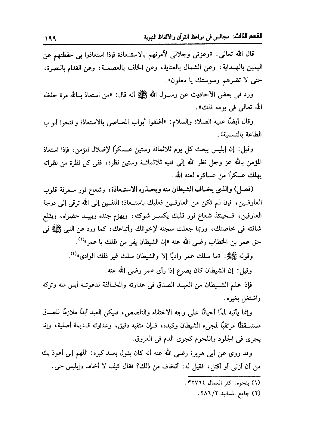 (فصل) والذي يخاف الشيطان منه ويحذره الاستعاذة، وشعاع نور معرفة قلوب العارفين، فإن لم تكن من العارفين فعليك باستعاذة المتقين إلى الله ترقى إلى درجة العارفين، فحينئذ شعاع نور قلبك يكسر شوكته، ويهزم جنده ويبيد حضراه، ويقلع شافته في خاصتك، وربما جعلت سجنه لإخوانك وأتباعك، كما ورد عن النبي -صلى الله عليه وسلم- في حق عمر بن الخطاب -رضي الله عنه-: «إن الشيطان يفر من ظلك يا عمر».