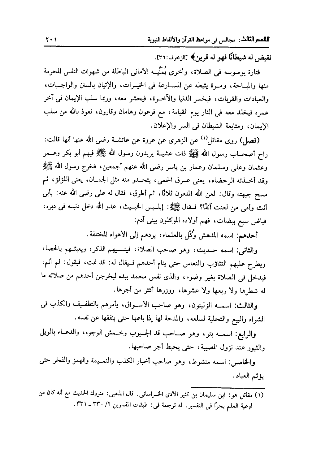 (فصل) روى مقاتل عن الزهري عن عروة عن عائشة -رضي الله عنها- أنها قالت: راح أصحاب رسول الله -صلى الله عليه وسلم- ذات عشية يريدون رسول الله صلى الله عليه وسلم فيهم أبو بكر وعمر وعثمان وعلي وسلمان وعمار بن ياسر -رضي الله عنهم أجمعين-، فخرج رسول الله -صلى الله عليه وسلم- وقد أخذته الرحضاء، يعني عرق الحمى، يتحدر منه مثل الجمان، يعني اللؤلؤ، ثم مسح جبهته وقال: لعن الله الملعون ثلاثًا، ثم أطرق، فقال له علي -رضي الله عنه-: بأبي أنت وأمي من لعنت آنفًا؟ فقال -صلى الله عليه وسلم-: إبليس الخبيث، عدو الله دخل ذنبه في دبره، فباض سبع بيضات، فهم أولاده الموكلون ببني آدم: