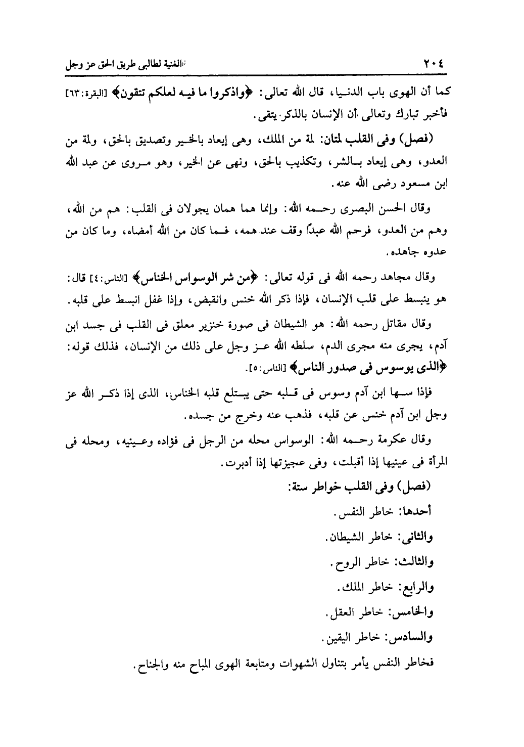 (فصل) وفي القلب لمتان: لمة من الملك، وهي إيعاد بالخير وتصديق بالحق، ولمة من العدو، وهي إيعاد بالشر، وتكذيب بالحق، ونهي عن الخير، وهو مروي عن عبد الله ابن مسعود -رضي الله عنه-.