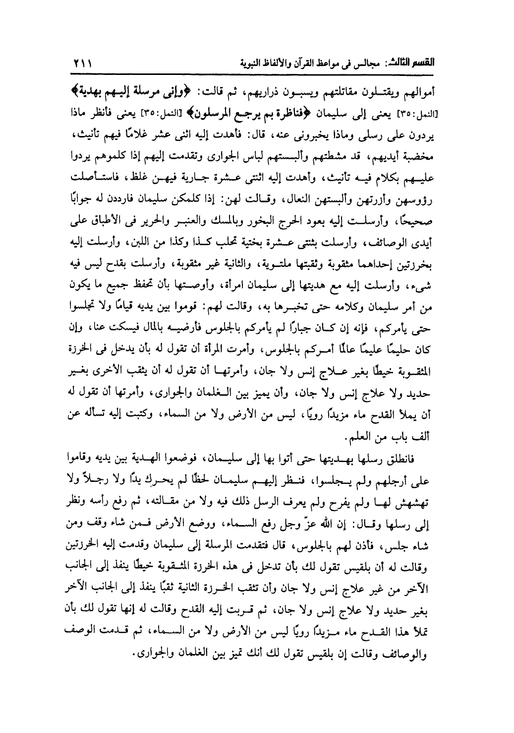 أموالهم ويقتلون مقاتلتهم ويسبون ذراريهم، ثم قالت: {وإني مرسلة إليهم بهدية} [النمل: 35] يعني إلى سليمان {فناظرة بم يرجع المرسلون} [النمل: 35] يعني فأنظر ماذا يردون على رسلي وماذا يخبروني عنه، قال: فأهدت إليه اثنى عشر غلامًا فيهم تأنيث، مخضبة أيديهم، قد مشطتهم وألبستهم لبس الجواري وتقدمت إليهم إذا كلموهم يردوا عليهم بكلام فيه تأنيث، وأهدت إليه اثنتي عشرة جارية فيهن غلظ، فاستأصلت رؤوسهن وأزرتهن وألبستهن النعال، وقالت لهن: إذا كلمكن سليمان فارددن له جوابًا صحيحًا، وأرسلت إليه بعود الحرج البخور وبالمسك والعنبر والحرير في الأطباق على أيدي الوصائف، وأرسلت باثنتي عشرة بختية تحلب كذا وكذا من اللبن، وأرسلت إليه بخرزتين إحداهما مثقوبة وثقبتها ملتوية، والثانية غير مثقوبة، وأرسلت بقدح ليس فيه شيء، وأرسلت إليه مع هديتها إلى سليمان امرأة، وأوصتها بأن تحفظ جميع ما يكون من أمر سليمان وكلامه حتى تخبرها به، وقالت لهم: قوموا بين يديه قيامًا ولا تجلسوا حتى يأمركم، فإنه إن كان جبارًا لم يأمركم بالجلوس فأرضيه بالمال فيسكت عنا، وإن كان حليمًا عليمًا عالمًا أمركم بالجلوس، وأمرت المرأة أن تقول له بأن يدخل في الخرزة المثقوبة خيطًا بغير علاج إنس ولا جان، وأمرتها أن تقول له أن يثقب الأخرى بغير حديد ولا علاج إنس ولا جان، وأن يميز بين الغلمان والجواري، وأمرتها أن تقول له أن يملأ القدح ماء مزيدًا رويًا، ليس من الأرض ولا من السماء، وكتبت إليه تسأله عن ألف باب من العلم.