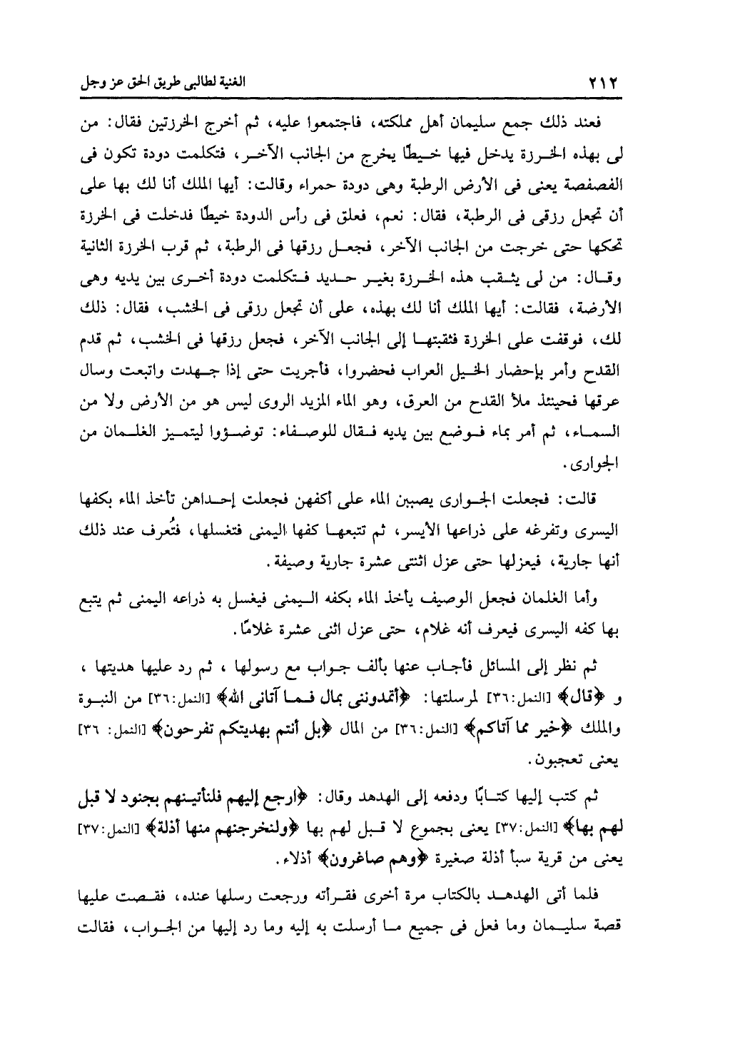 فعند ذلك جمع سليمان أهل مملكته، فاجتمعوا عليه، ثم أخرج الخرزتين فقال: من لي بهذه الخرزة يدخل فيها خيطًا يخرج من الجانب الآخر، فتكلمت دودة تكون في الفصفصة يعني في الأرض الرطبة وهي دودة حمراء وقالت: أيها الملك أنا لك بها على أن تجعل رزقي في الرطبة، فقال: نعم، فعلق في رأس الدودة خيطًا فدخلت في الخرزة تحكها حتى خرجت من الجانب الآخر، فجعل رزقها في الرطبة، ثم قرب الخرزة الثانية وقال: من لي يثقف هذه الخرزة بغير حديد فتكلمت دودة أخرى بين يديه وهي الأرضة، فقالت: أيها الملك أنا لك بهذه، على أن تجعل رزقي في الخشب، فقال: ذلك لك، فوقفت على الخرزة فثقبتها إلى الجانب الآخر، فجعل رزقها في الخشب، ثم قدم القدح وأمر بإحضار الخيل العراب فحضروا، فأجريت حتى إذا جهدت وسال عرقها فحينئذ ملأ القدح من العرق، وهو الماء المزيد الروي ليس هو من الأرض ولا من السماء، ثم أمر بماء فوضع بين يديه فقال للوصفاء: توضؤوا ليتميز الغلمان من الجواري.