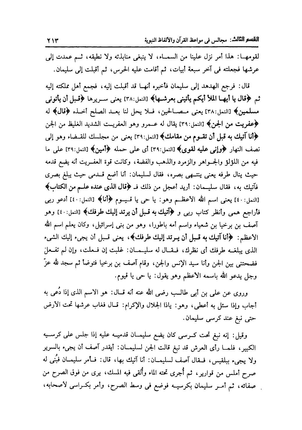 قال: فرجع الهدهد إلى سليمان فأخبره أنها قد أقبلت إليه، فجمع أهل مملكته إليه ثم {قال يا أيها الملأ أيكم يأتيني بعرشها} [النمل: 38] يعني سريرها {قبل أن يأتوني مسلمين} [النمل: 38] يعني مصالحين، فلا يحل لنا بعد الصلح أخذه {قال} له {عفريت من الجن} [النمل: 39] يقال له عمرو وهو العفريت الشديد الغليظ من الجن {أنا آتيك به قبل أن تقوم من مقامك} [النمل: 39] يعني من مجلسك للقضاء وهو إلى نصف النهار {وإني عليه لقوي} [النمل: 39] أي على حمله {أمين} [النمل: 39] على ما فيه من اللؤلؤ والجواهر والزمرد والذهب والفضة، وكانت قوة العفريت أنه يضع قدامه حيث ينال طرفه يعني ينتهي بصره، فقال لسليمان: أنا أضع قدمي حيث يبلغ بصري فآتيك به، فقال سليمان: أريد أعجل من ذلك فـ {قال الذي عنده علم من الكتاب} [النمل: 40] يعني اسم الله الأعظم وهو: يا حي يا قيوم {أنا} [النمل: 40] أدعو ربي فأراجع همي وأنظر كتاب ربي و {آتيك به قبل أن يرتد إليك طرفك} [النمل: 40] وهو آصف بن برخيا بن شعياء واسم أمه باطورا، وهو من بني إسرائيل، وكان يعلم اسم الله الأعظم: {أنا آتيك به قبل أن يرتد إليك طرفك} يعني قبل أن يجيء إليك الشيء الذي يبلغه طرفك أي نظرك، فقال له سليمان: غلبت إن فعلت، وإن لم تفعل فضحتني بين الجن وأنا سيد الإنس والجن، وقام آصف بن برخيا فتوضأ ثم سجد لله -عز وجل- يدعو الله باسمه الأعظم وهو يقول: يا حي يا قيوم.