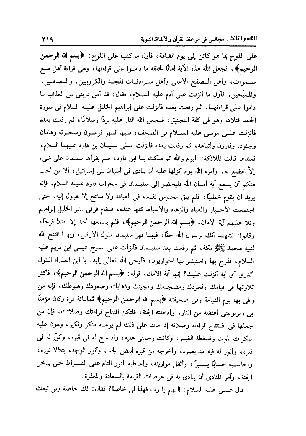 على اللوح بما هو كائن إلى يوم القيامة، فأول ما كتب على اللوح: {بسم الله الرحمن الرحيم}، فجعل الله هذه الآية أمانًا لخلقه ما داموا على قراءتها، وهي قراءة أهل سبع سموات، وأهل الصفح الأعلى وأهل سرادقات المجد والكروبيين، والصافين، والمسبحين، فأول ما أنزلت على آدم -عليه السلام-، فقال: قد أمن ذريتي من العذاب ما داموا على قراءتها، ثم رفعت بعده فأنزلت على إبراهيم الخليل -عليه السلام- في سورة الحمد فتلاها وهو في كفة المنجنيق، فجعل الله النار عليه بردًا وسلامًا، ثم رفعت بعده فأنزلت على موسى -عليه السلام- في الصحف، فبها قهر فرعون وسحرته وهامان وجنوده وقارون وأتباعه، ثم رفعت بعده فأنزلت على سليمان بن داود عليهما السلام، فعندها قالت الملائكة: اليوم والله تم ملكك يا ابن داود، فلم يقرأها سليمان على شيء إلا خضع له، وأمره الله يوم أنزلها عليه أن ينادي في أسباط بني إسرائيل، ألا من أحب منكم أن يسمع آية أمان الله فليحضر إلى سليمان في محراب داود -عليه السلام-، فإنه يريد أن يقوم خطيبًا، فلم يبق محبوس نفسه في العبادة ولا سائح إلا هرول إليه، حتى اجتمعت الأحبار والعباد والزهاد والأسباط كلها عنده، فقام فرقى منبر الخليل إبراهيم وتلا عليهم آية الأمان: {بسم الله الرحمن الرحيم} فلم يسمعها أحد إلا امتلأ فرحًا، وقالوا: نشهد أنك لرسول الله حقًا، فبها قهر سليمان ملوك الأرض، وبها افتتح لنبيه محمد -صلى الله عليه وسلم- مكة، ثم رفعت بعد سليمان فأنزلت على المسيح عيسى ابن مريم -عليه السلام-، ففرح بها واستبشر بها الحواريون، فأوحى الله تعالى إليه: يا ابن العذراء البتول أتدري أي آية أنزلت عليك؟ إنها آية الأمان، قوله: {بسم الله الرحمن الرحيم} فأكثر تلاوتها في قيامك وقعودك ومضجعك ومجيئك وذهابك وصعودك وهبوطك، فإنه من وافى بها يوم القيامة وفي صحيفته {بسم الله الرحمن الرحيم} ثمانمائة مرة وكان مؤمنًا بي وبربوبيتي أعتقته من النار، وأدخلته الجنة، فتلكن افتتاح قراءتك وصلاتك، فإن من جعلها في افتتاح قراءته وصلاته إذا مات على ذلك لم يرعه منكر ونكير، وهون عليه سكرات لموت وضغطة القبر، وكانت رحمتي عليه، وأفسح له في قبره، وأنور له في قبره، وأنور له فيه مد بصره، وأخرجه من قبره أبيض الجسم وأنور الوجه، يتلألأ نوره، وأحاسبه حسابًا يسيرًا، وأثقل موازينه، وأعطيه النور التام على الصراط حتى يدخل الجنة، وآمر المنادي أن ينادي به في عرصات القيامة بالسعادة والمغفرة.