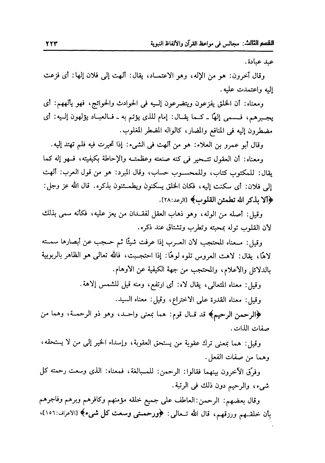 ومعناه: أن العقول تتحير في كنه صنعته وعظمته والإحاطة بكيفيته، فهو إله كما يقال: للمكتوب كتاب، وللمحسوب حساب، وقال المبرد: هو من قول العرب: ألهت إلا فلان: أي سكنت إليه، فكان الخلق يسكنون ويطمئنون بذكره. قال الله -عز وجل-: {ألا بذكر الله تطمئن القلوب} [الرعد: 28].