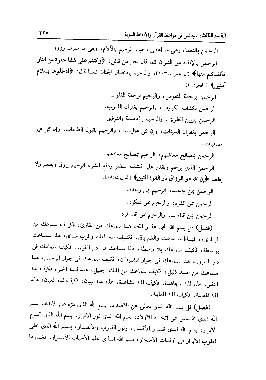 (فصل) قل بسم الله الذي تعالى عن الأضداد، بسم الله الذي تنزه عن الأنداد، بسم الله الذي تقدس عن اتخاذ الأولاد، بسم الله الذي نور الأنوار، بسم الله الذي أكرم الأبرار، بسم الله الذي قدر الأقدار، ونور القلوب والأبصار، بسم الله الذي تجلى لقلوب الأبرار في أوقات الأسحار، بسم الله الذي علم الأحباب الأسرار، فغمرها