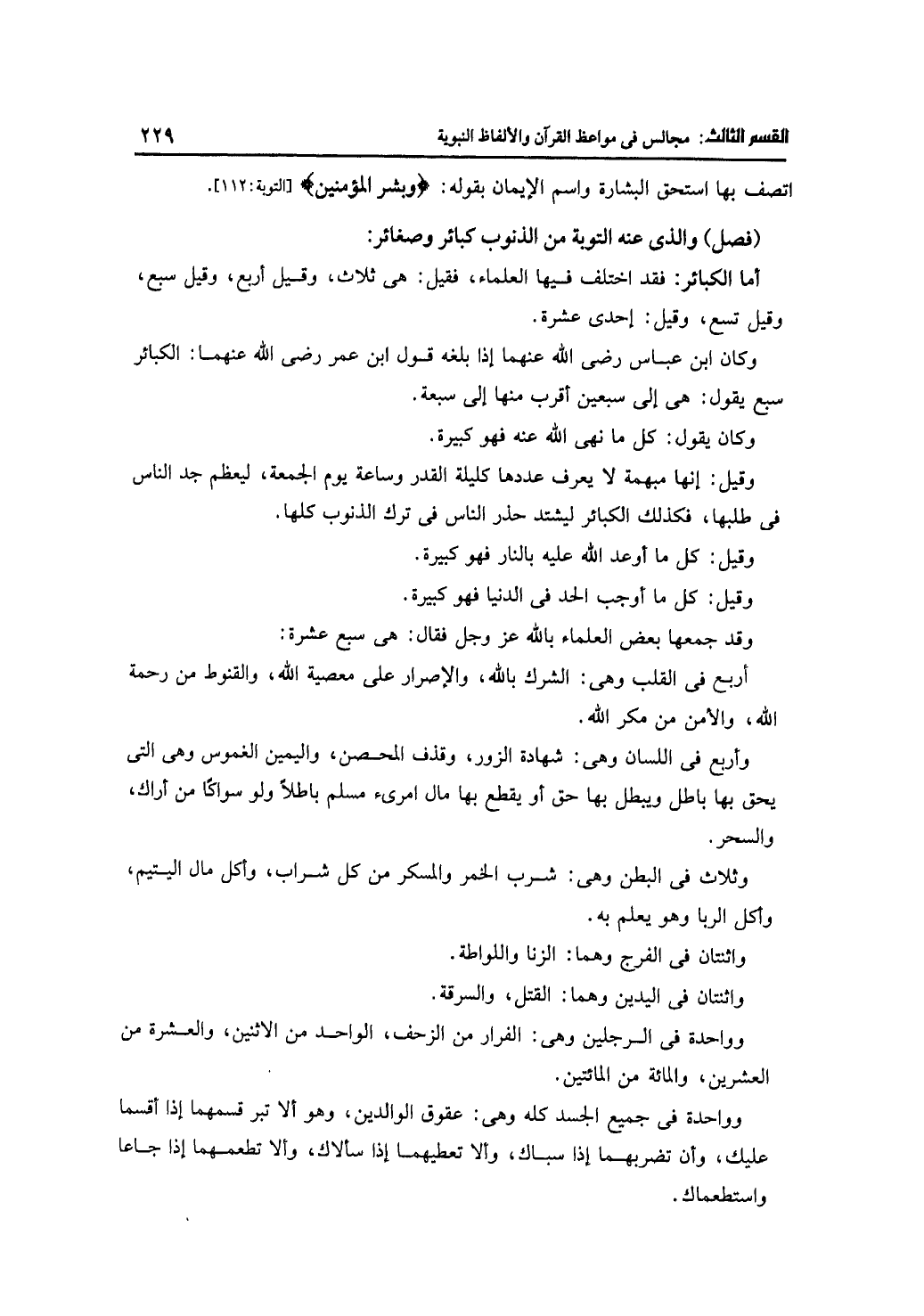 (فصل) والذي عنه التوبة من الذنوب كبائر وصغائر: